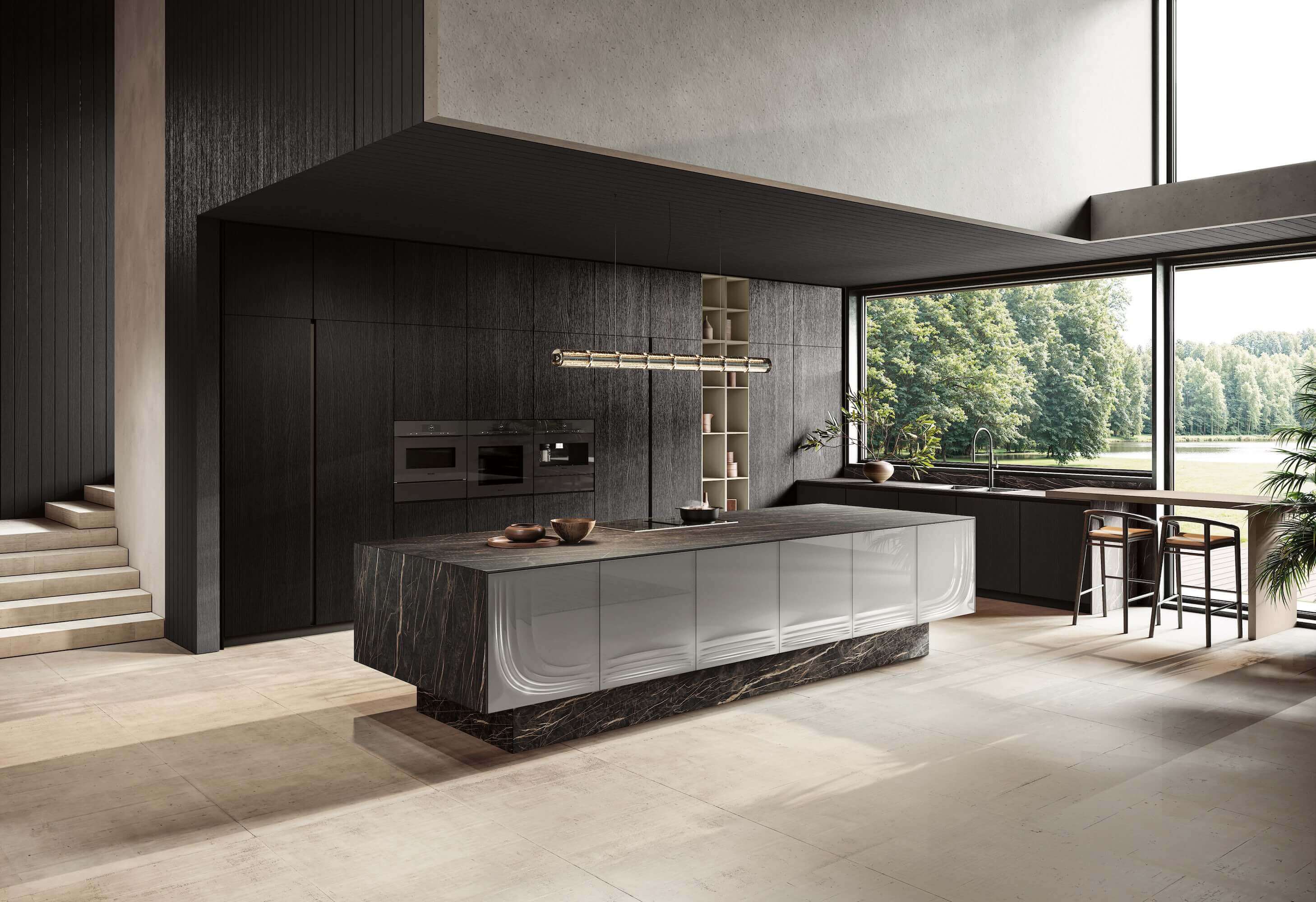 Кухонный остров ONDA — центральный элемент коллекции, доступный в длине от 180 до 360 см при фиксированной глубине 121,8 см. Он включает варочную панель (с возможной встроенной вытяжкой), мойку и модули с выдвижными ящиками, корзинами и внутренними отделениями.