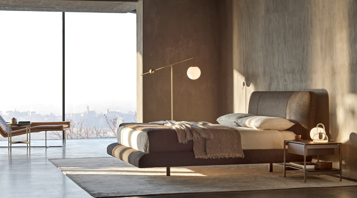 Кровать выделяется высоким мягким изголовьем и тщательно проработанным основанием с отделочными полосами. Такое сочетание придаёт модели особую выразительность и открывает возможности для индивидуальной персонализации интерьера.