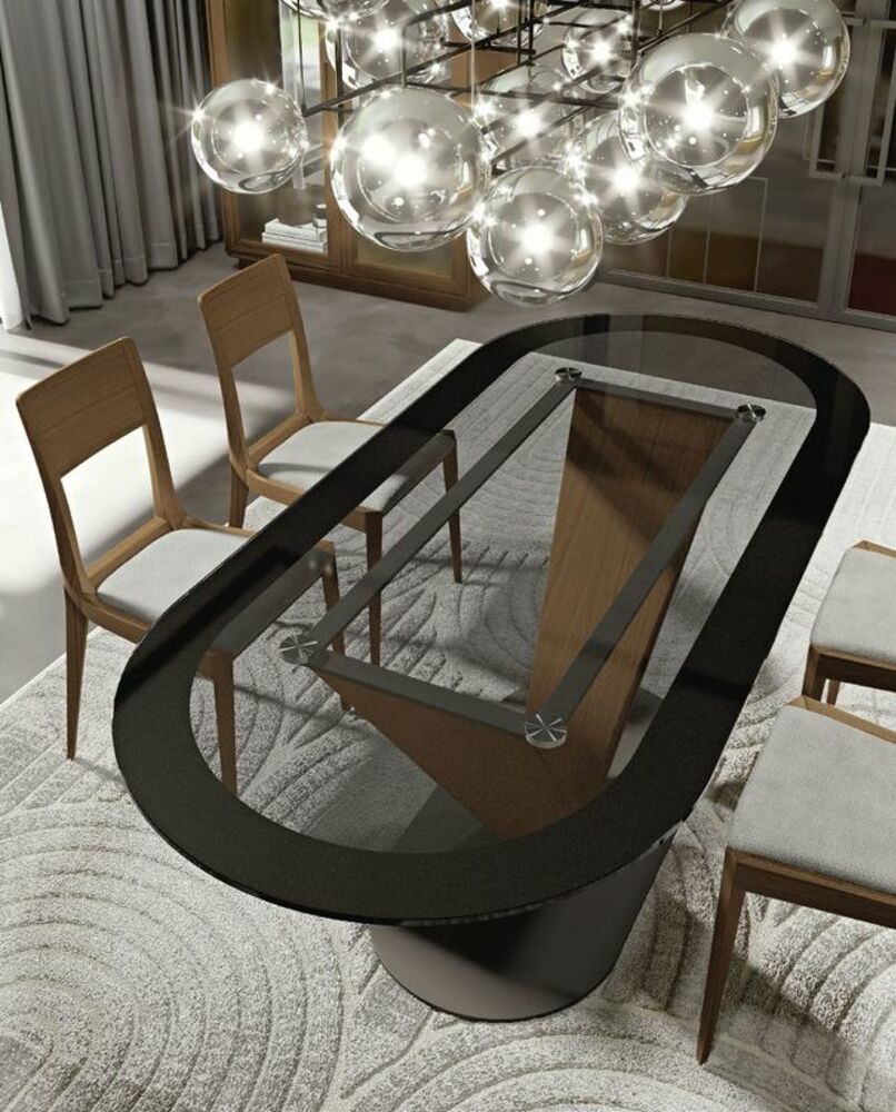Столешница выполнена из дымчатого стекла и металла — сочетание, которое отражает современный взгляд на классику: визуальная лёгкость стекла и матовая прочность металла в одном изделии.