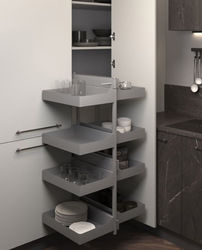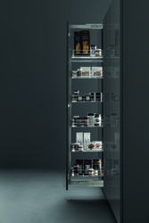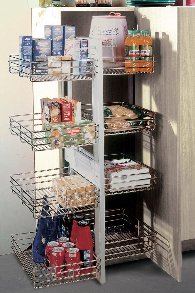 Хранение в выдвижных вертикальных шкафах. Помогает экономить пространство и сохранять порядок.