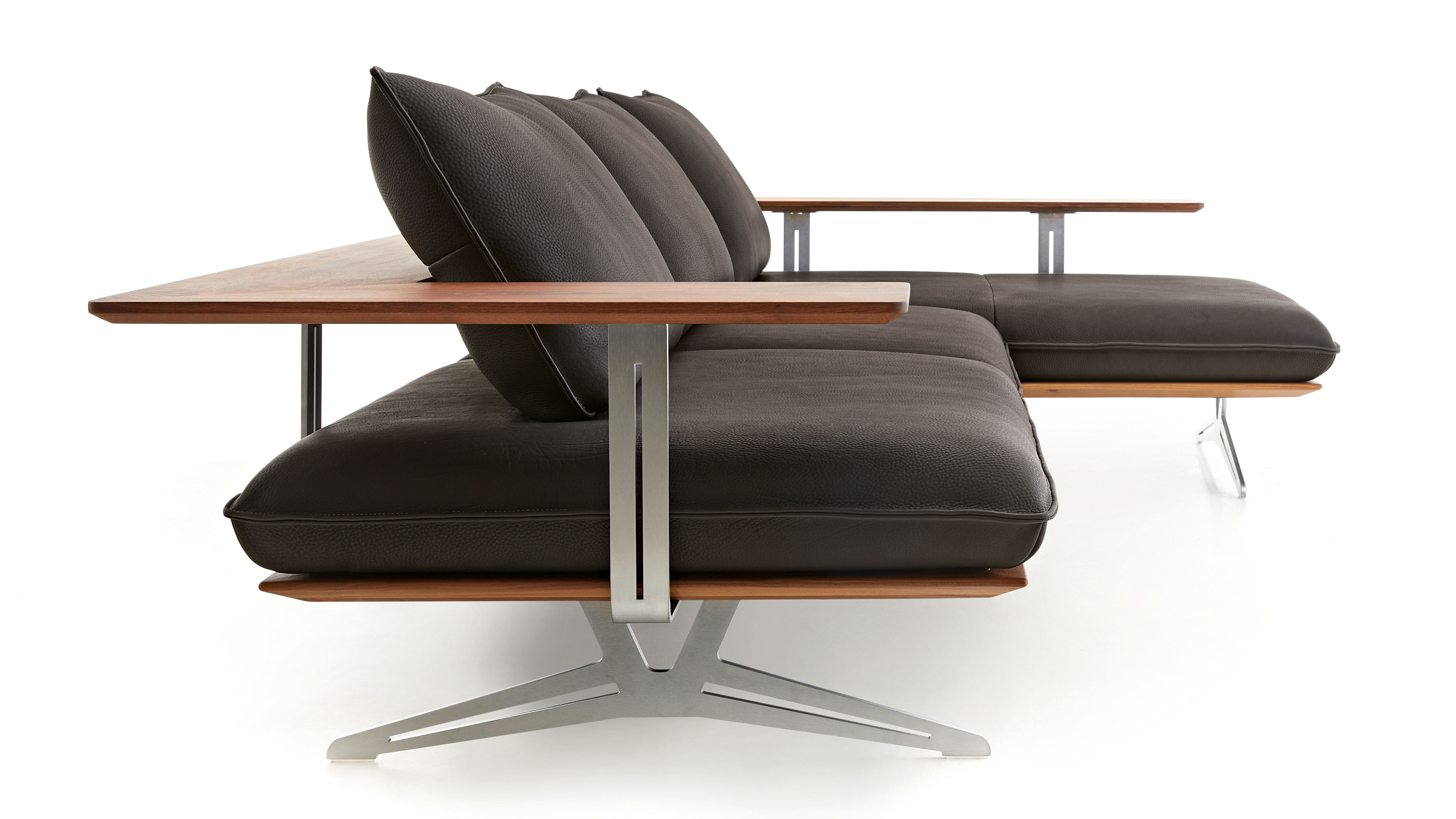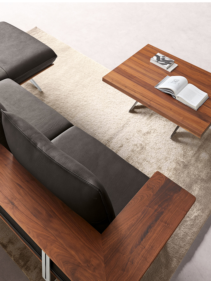 Элегантно изогнутые металлические ножки придают дивану воздушность, а элементы каркаса из массива — натуральный характер. Отделка — UV-покрытие с эффектом масла в оттенках ореха или натуральной дикой лиственицы — добавляет модели теплоту и выразительность.