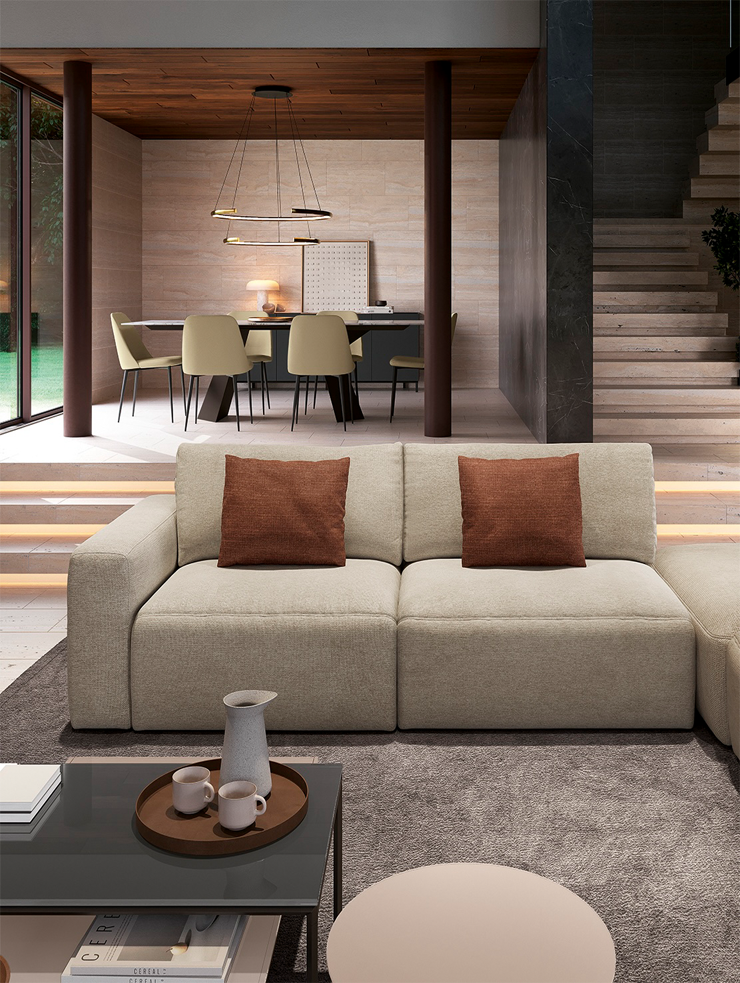 Благодаря симметричной модульности и универсальному шезлонгу, Parioli легко адаптируется к любому помещению. Он одинаково хорошо смотрится у стены и в центре комнаты, сохраняя ощущение простора и свободы.