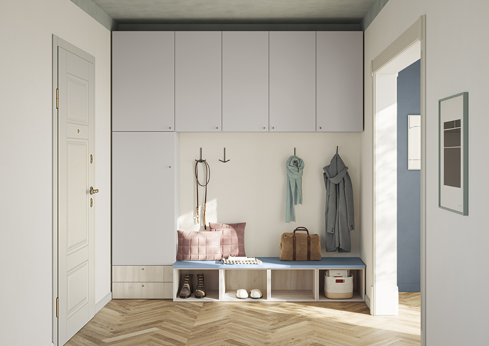 Чистый геометричный дизайн, премиальные материалы и широкая палитра отделок позволяют системе Momenti гармонично сочетаться с общим стилем дома. Даже небольшое пространство превращается в организованную зону, где всё — от обуви до верхней одежды и мелочей — на своём месте.