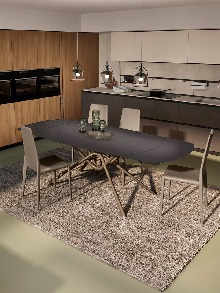 С Aspen вы создаёте интерьер, отражающий ваш вкус. Его конструкция позволяет выбирать из множества комбинаций: металл в основании и разнообразие материалов для столешницы открывают бесконечные возможности для персонализации. Стол может быть фиксированным или раздвижным, в прямоугольной или мягкой овальной форме, что делает его идеальным как для камерных ужинов, так и для масштабных встреч в кругу семьи и друзей.