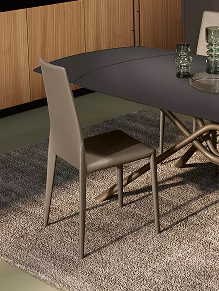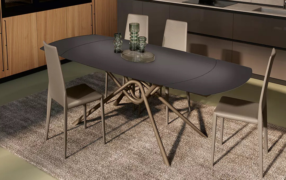 Aspen мгновенно становится центром внимания благодаря своему выразительному дизайну. Его металлическая основа элегантно сочетается со столешницами из благородных материалов — от сияющего кристалла до прочной SuperCeramica или утончённого SuperMarmo. Форма стола — прямоугольная или бочкообразная — и возможность раздвижения делают Aspen универсальным выбором для интерьера любого масштаба, будь то уютный ужин или приём гостей.