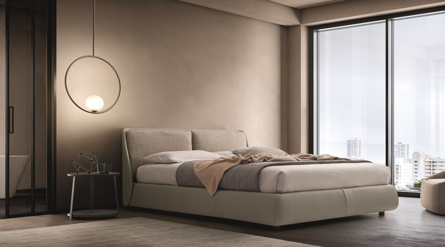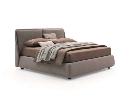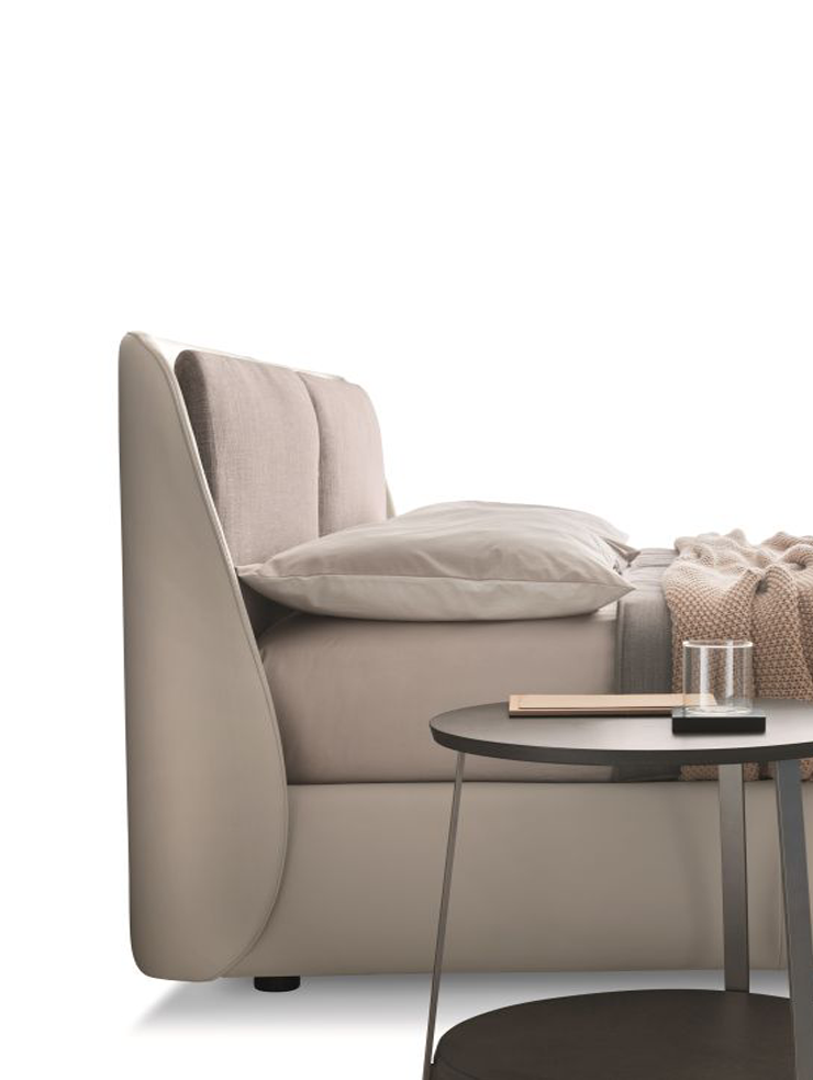 Кровать выделяется прочной спинкой, в которую встроены мягкие подушки, идеально подходящие для чтения и отдыха. Доступные варианты отделки — ткань, кожа или их комбинация — позволяют адаптировать модель под любой интерьер.