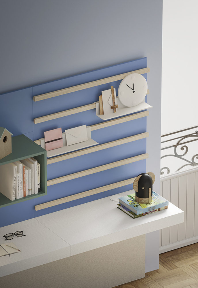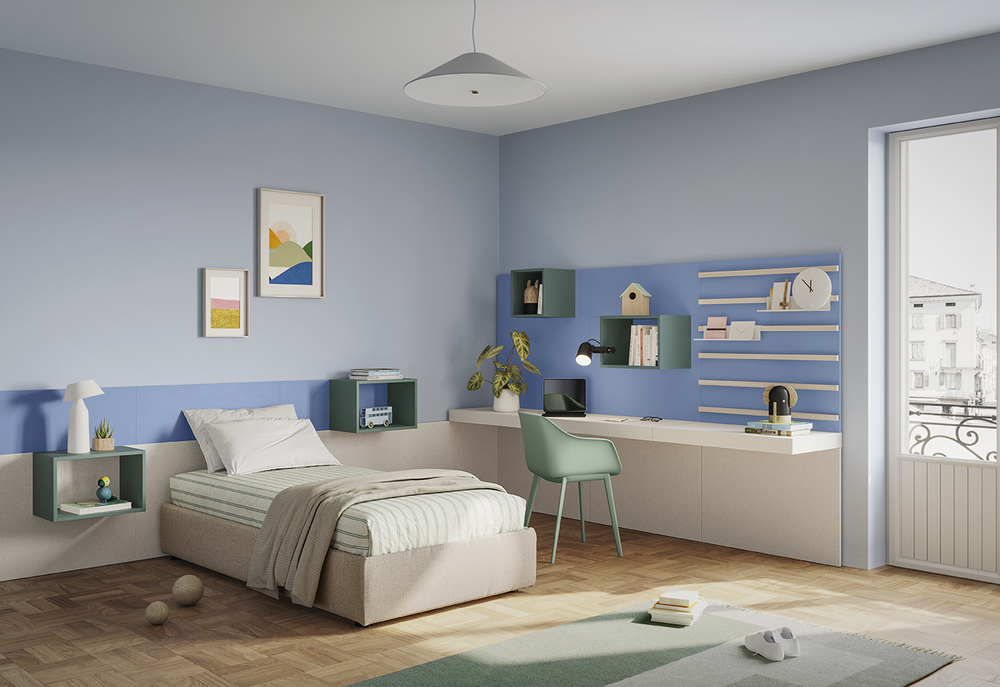 Модули легко трансформируются в зависимости от возраста и потребностей: кровати, рабочие зоны, системы хранения и декоративные элементы можно комбинировать, расширять или переосмысливать. Палитра оттенков и отделок предлагает широкий выбор — от ярких и жизнерадостных до спокойных и зрелых тонов.