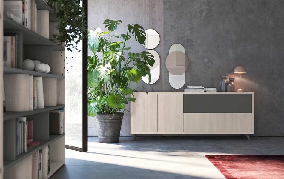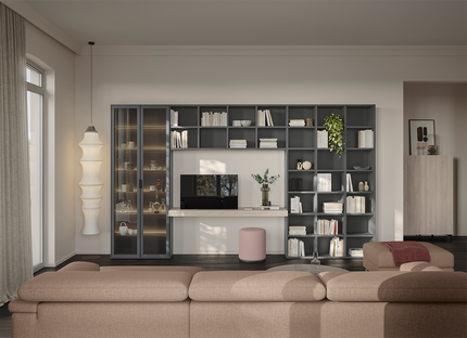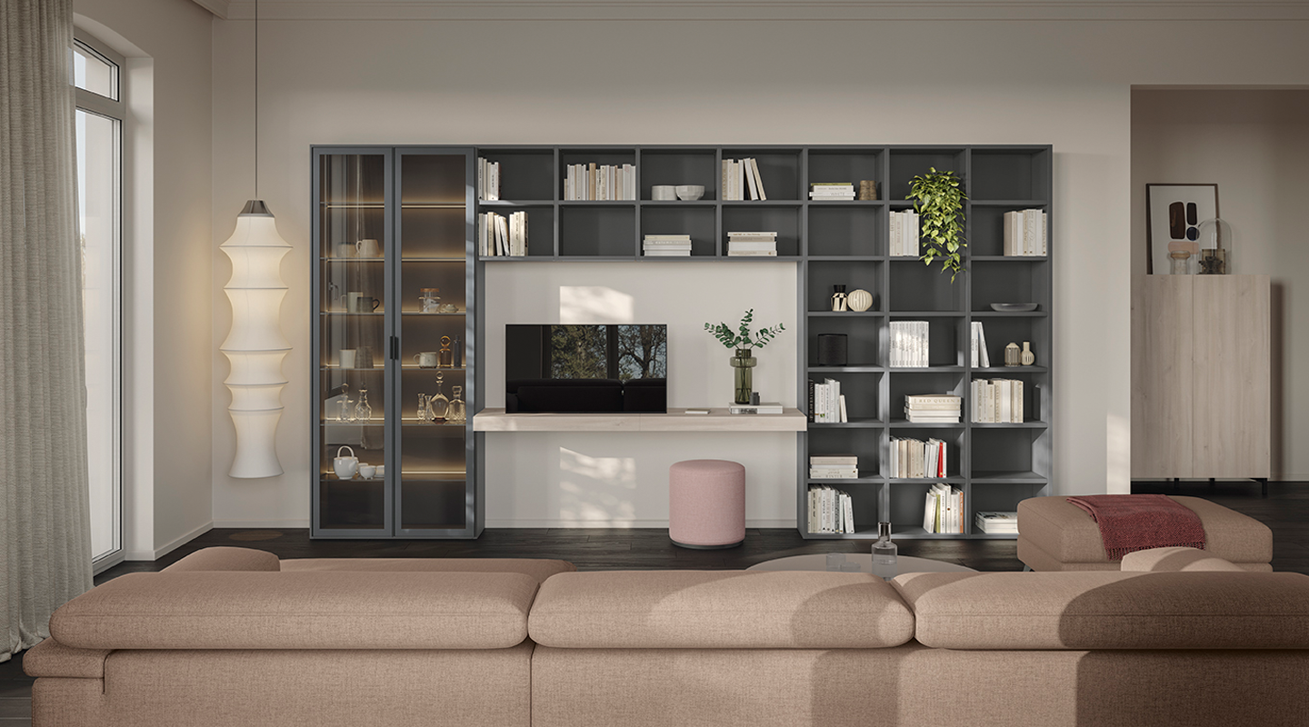 Здесь всё продумано до штриха: оттенки Titanio и натуральный шпон, прозрачные и закрытые модули — всё работает на одну цель: сделать пространство элегантным и живым. Это интерьер, где история не ретро, а вечная классика, адаптированная к ритму настоящего.