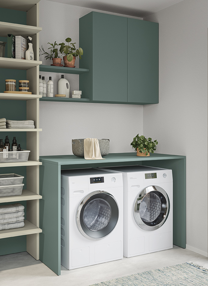 Гибкие конфигурации адаптируются под любую площадь и архитектуру. Система предлагает индивидуальные решения: навесные шкафы, встроенные отсеки под технику, открытые полки и скрытые ящики. Варианты отделки — от однотонных поверхностей до текстур натурального дерева (эвкалипт, белёный дуб, орех и др.) — позволяют интегрировать Laundry в общий стиль дома без компромиссов.