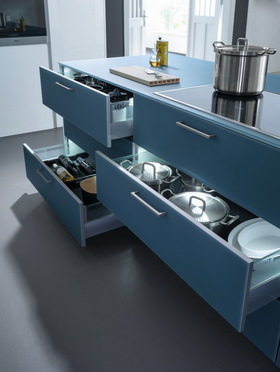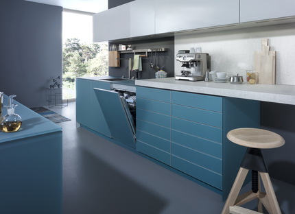 Широкая цветовая гамма обеспечивает спокойствие и открывает помещение. Свежие и оживляющие: стеклянные фасады в петроле, матовом сине-зеленом, в сочетании с блестящими, светло-серыми элементами шкафа. Стеклянная столешница толщиной всего 12 мм сливается заподлицо с фронтами и боковыми стенками в единый замкнутый куб