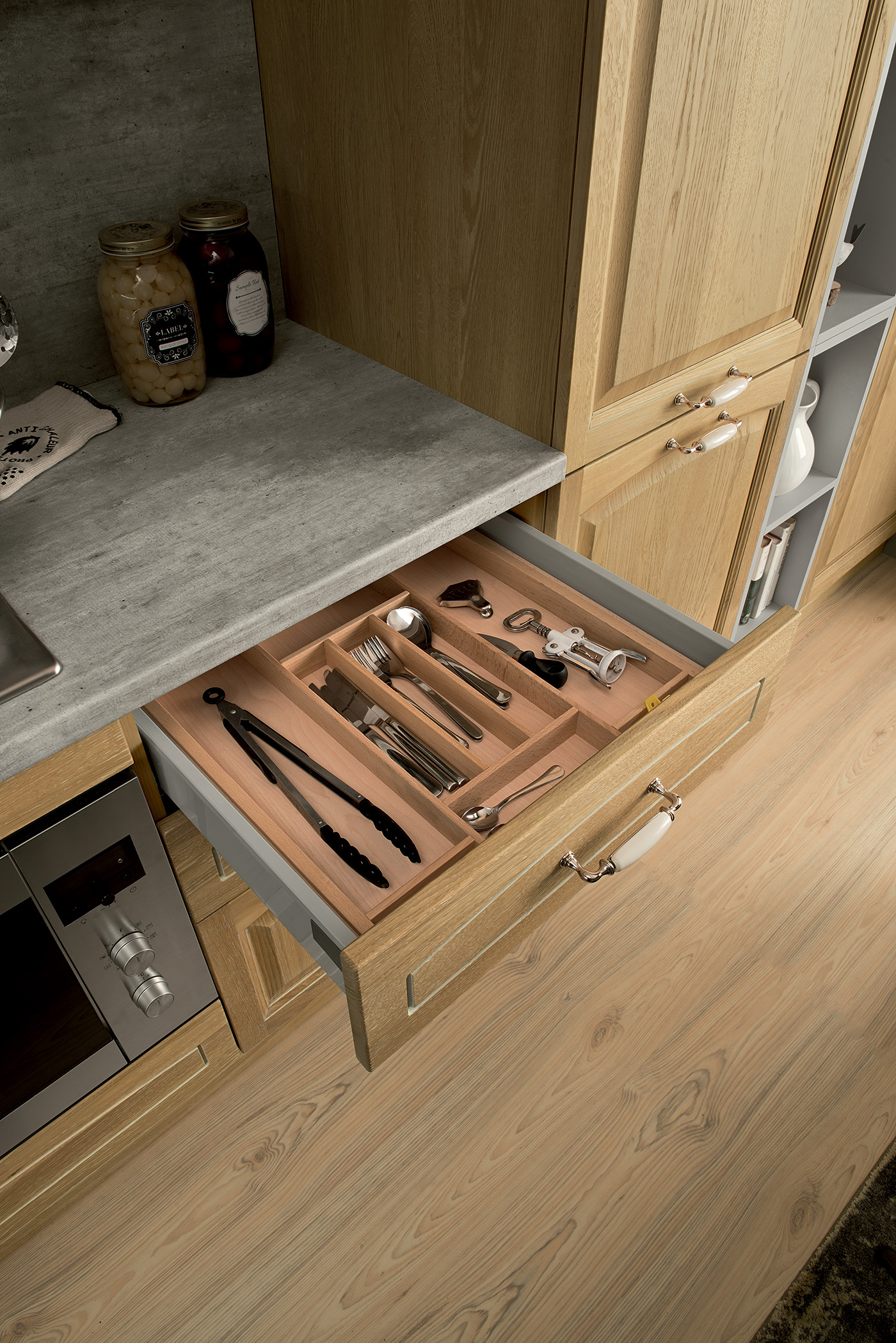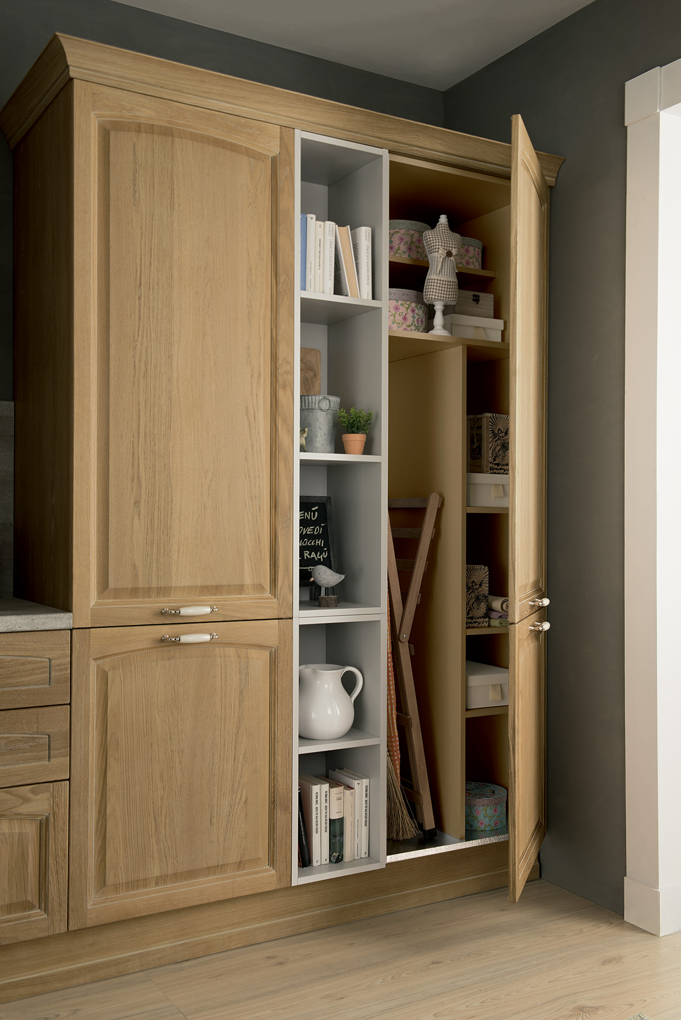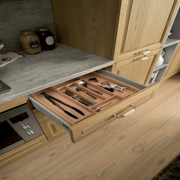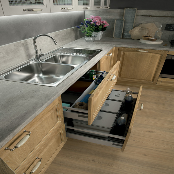 Фасады с эффектом натурального дуба подчёркивают природный стиль, а белые элементы добавляют лёгкость и визуальную чистоту. Эта модель — пример того, как простота может быть изысканной и функциональной одновременно.