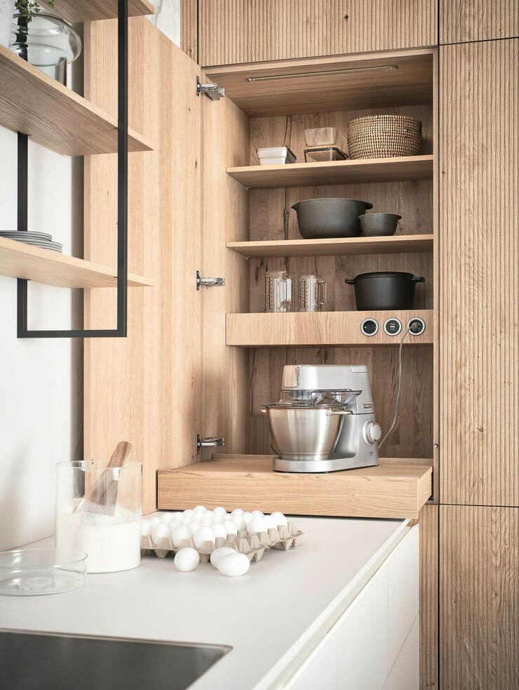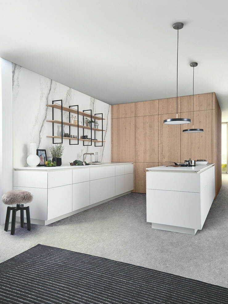 Здесь находят свое место облицованные при помощи BOSSA модули высоких шкафов с выдвижными полками и задвижными дверями. Благодаря поверхности эти безручечные модули воспринимаются как элементы домашнего уюта, а зона приготовления пищи визуально воспроизводится на обоих кухонных рядах. Модульная система стеллажей FIOS благодаря новой конструкции стойки доступна в качестве свободно висящего настенного элемента.