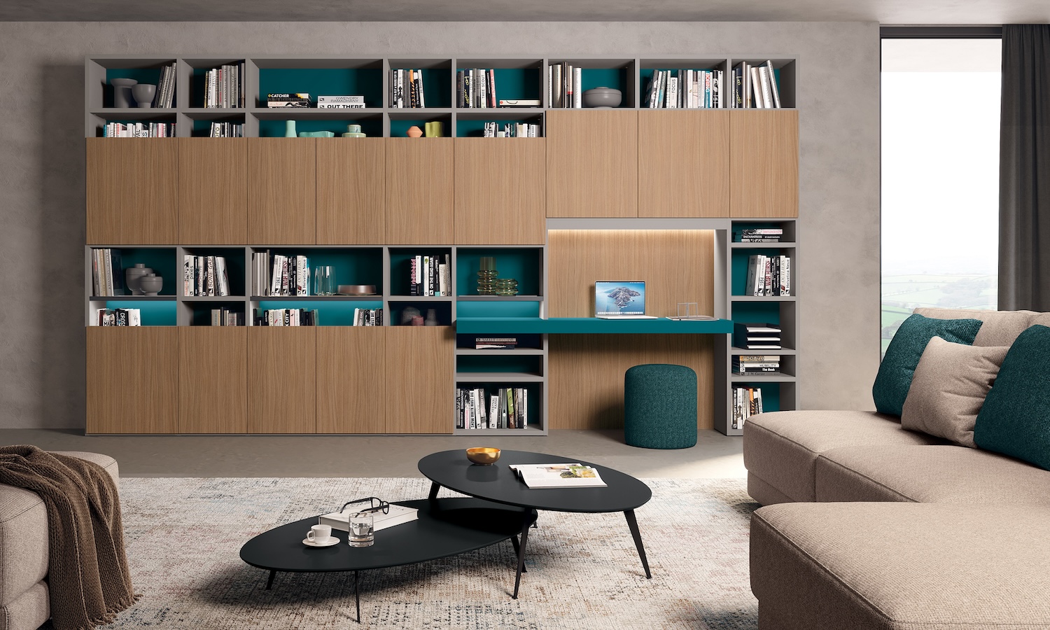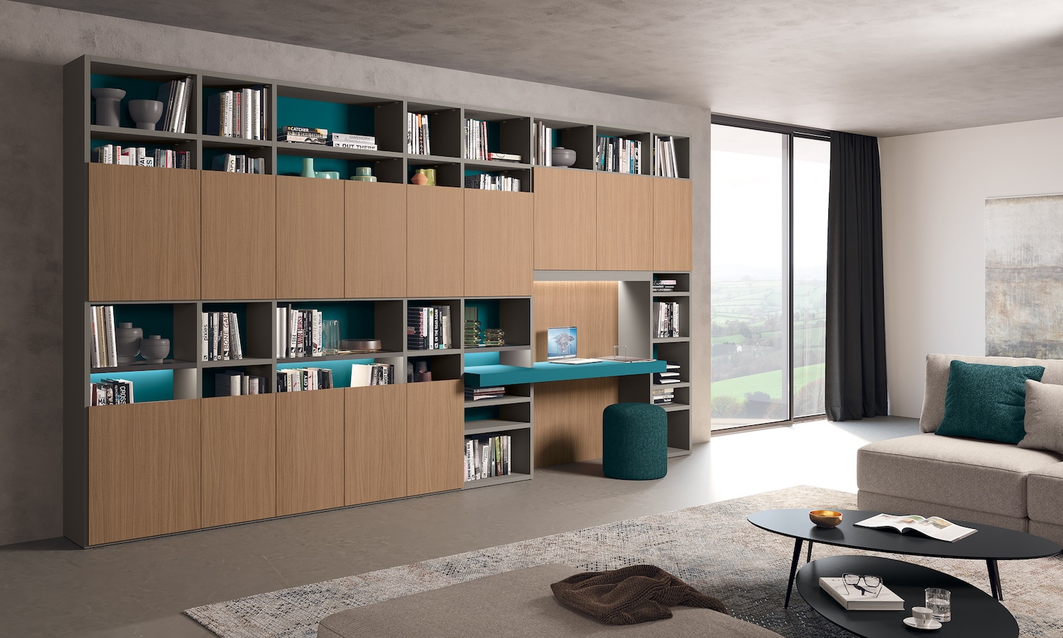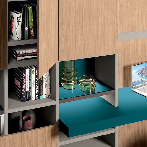 Изумрудная подсветка превращает эту композицию Trenta в настоящий арт-объект. Глубокое, благородное свечение придаёт системе загадочность и подчёркивает эстетику каждого элемента: от стеклянных полок до выверенных линий фасадов.