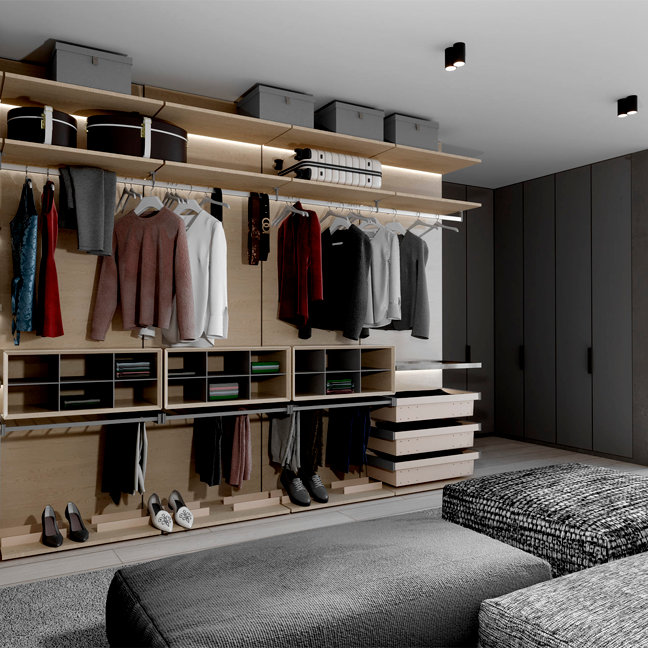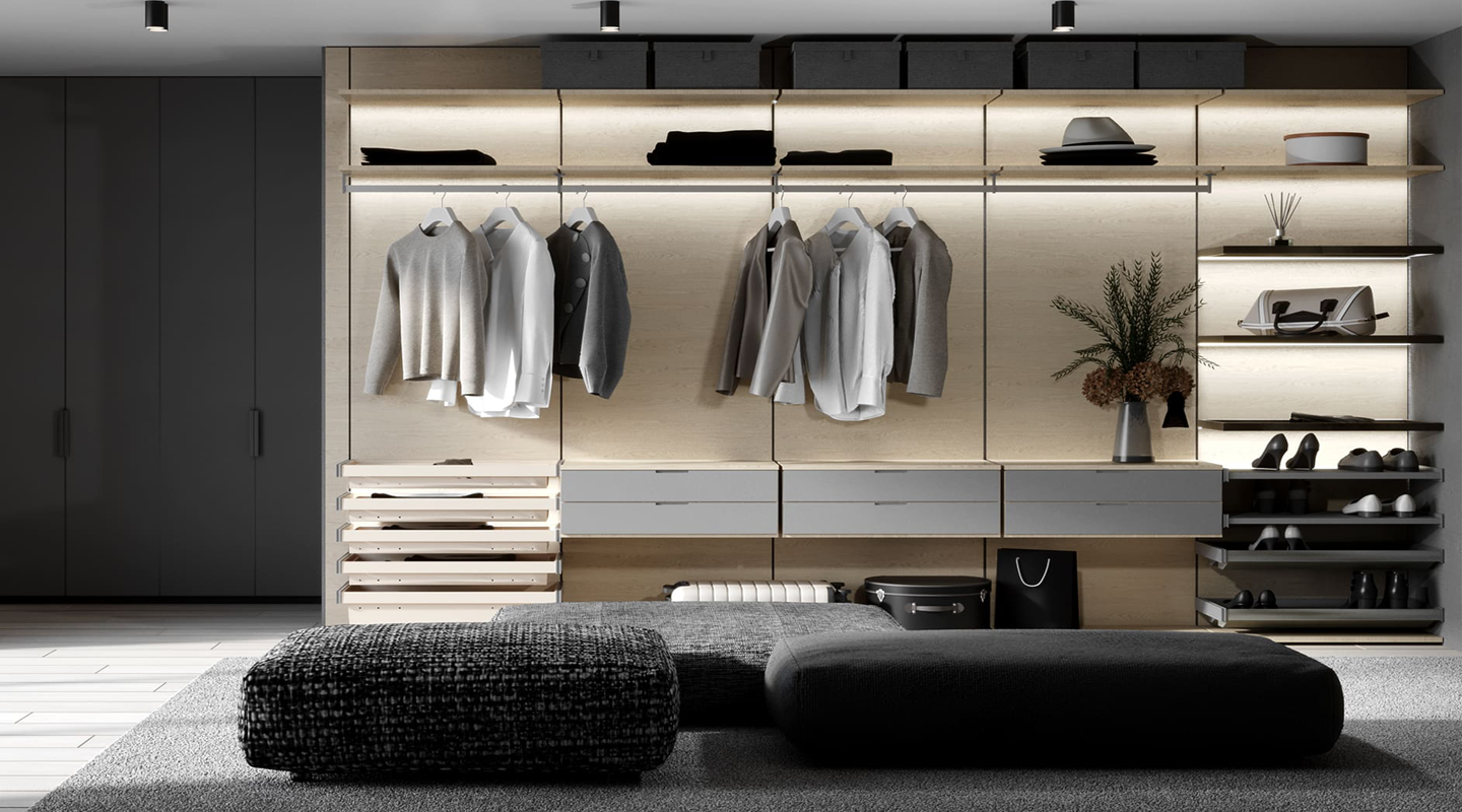 Система STENICO создаётся под индивидуальные запросы: от размеров и наполнения до отделки. Высота до 3000 мм и более 500 вариантов материалов позволяют адаптировать гардеробную под любое пространство.