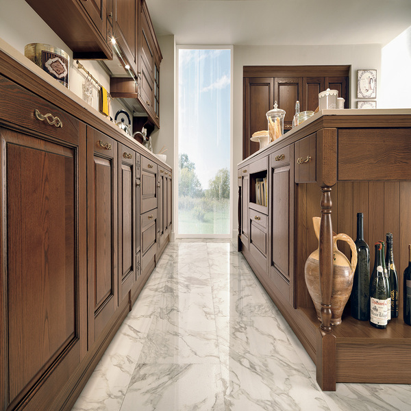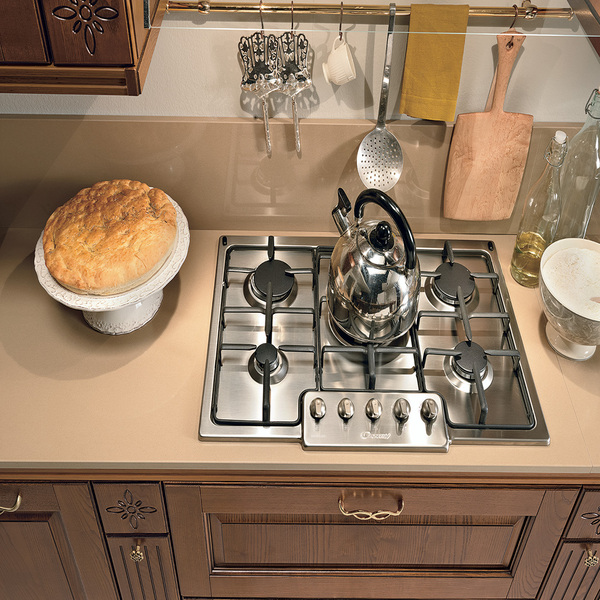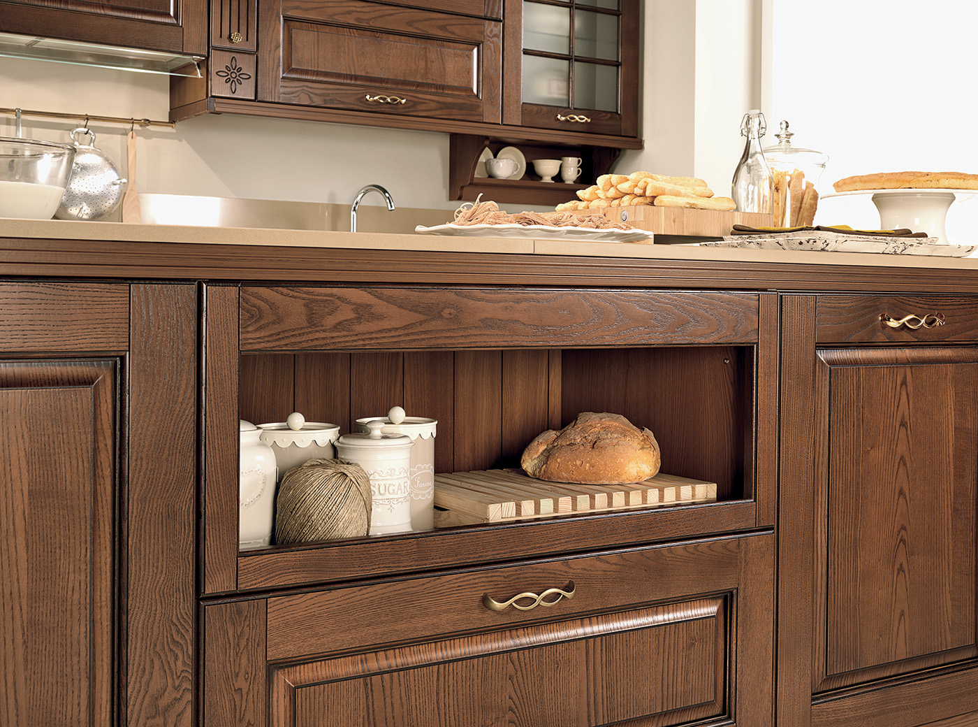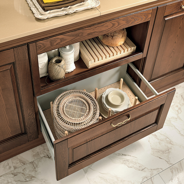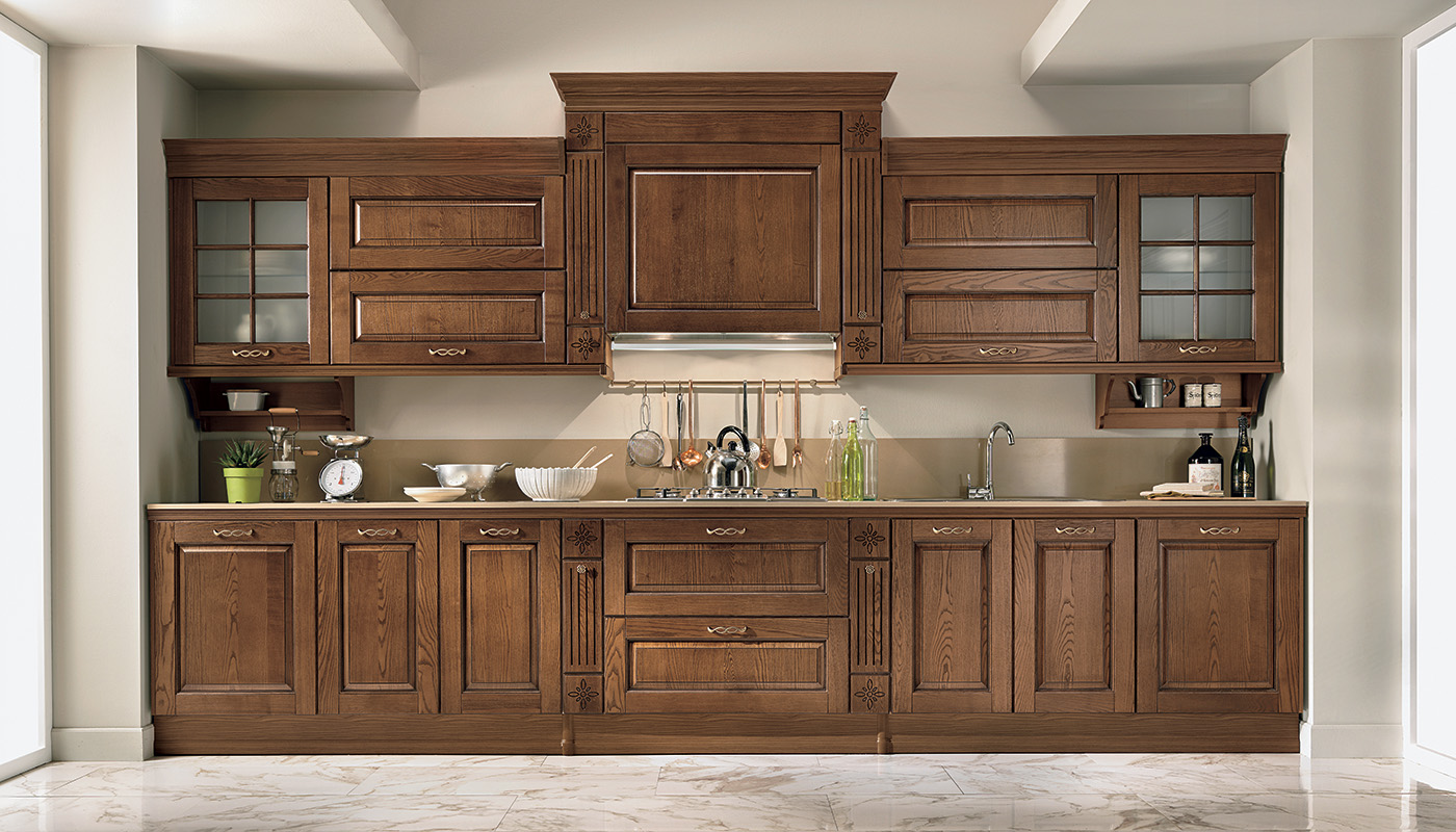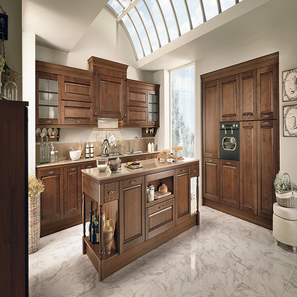 Глубокий оттенок Orzo Scuro подчеркивает благородный характер коллекции Armonia, а центральный остров превращает кухню в сердце дома — место для общения, готовки и вдохновения. Богатая текстура дерева, декоративные инкрустации и витражные фасады создают эффект тёплой классики, дополненной функциональностью современного пространства.