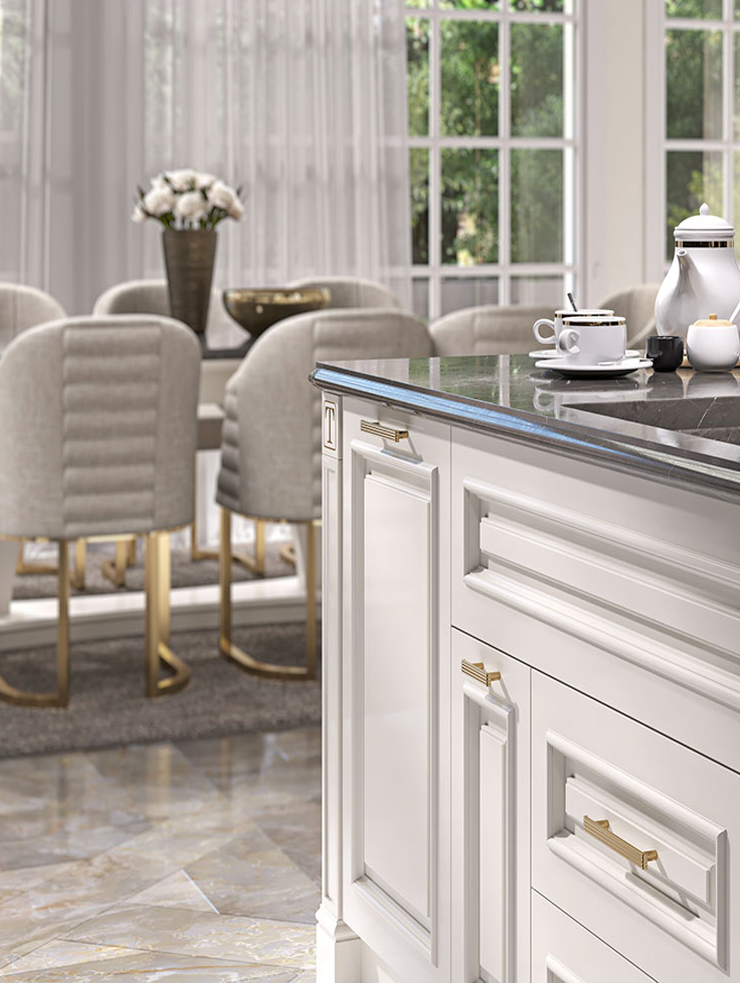 Эта модель создана для тех, кто выбирает не просто функциональность, а стиль. Благодаря чистому белому цвету и тонким золотым акцентам, кухня Vogue становится центральной частью интерьера, в которой гармонично сочетаются современность и классическая элегантность.