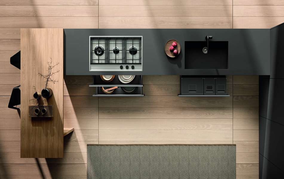Кухня Pratica L — это пространство, где каждая деталь работает на эстетику и удобство: от L-образного металлического профиля для открытия фасадов до утончённой фурнитуры и тщательно продуманных ниш. Элементы сочетаются в изящной геометрии, придавая интерьеру визуальную гармонию и архитектурную чёткость.