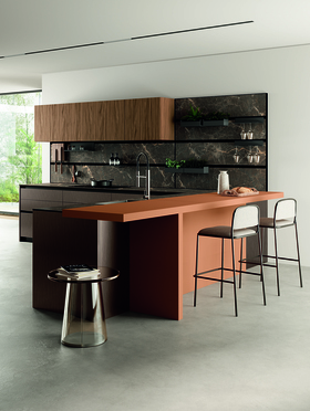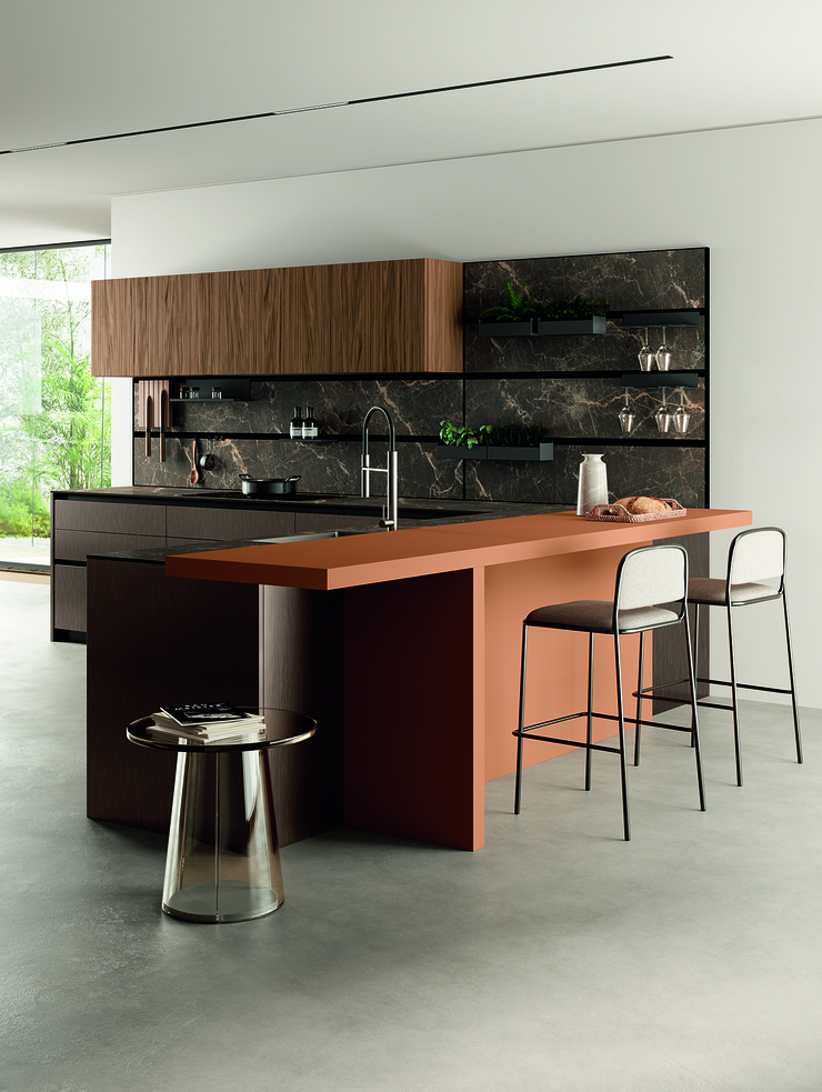 Сочетание мраморной отделки Abitum Marmo Brown Rigato и яркого цветового акцента делает композицию Pratica L визуально насыщенной и запоминающейся. Стильный остров с системой хранения и выразительная боазери создают не только практичную рабочую зону, но и сцену для жизни, полной вкуса, цвета и света.
