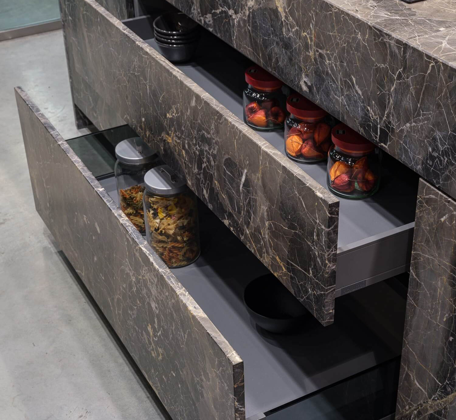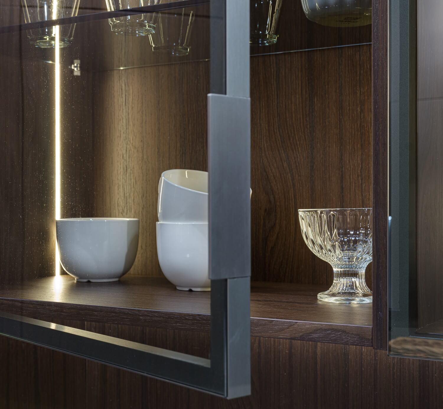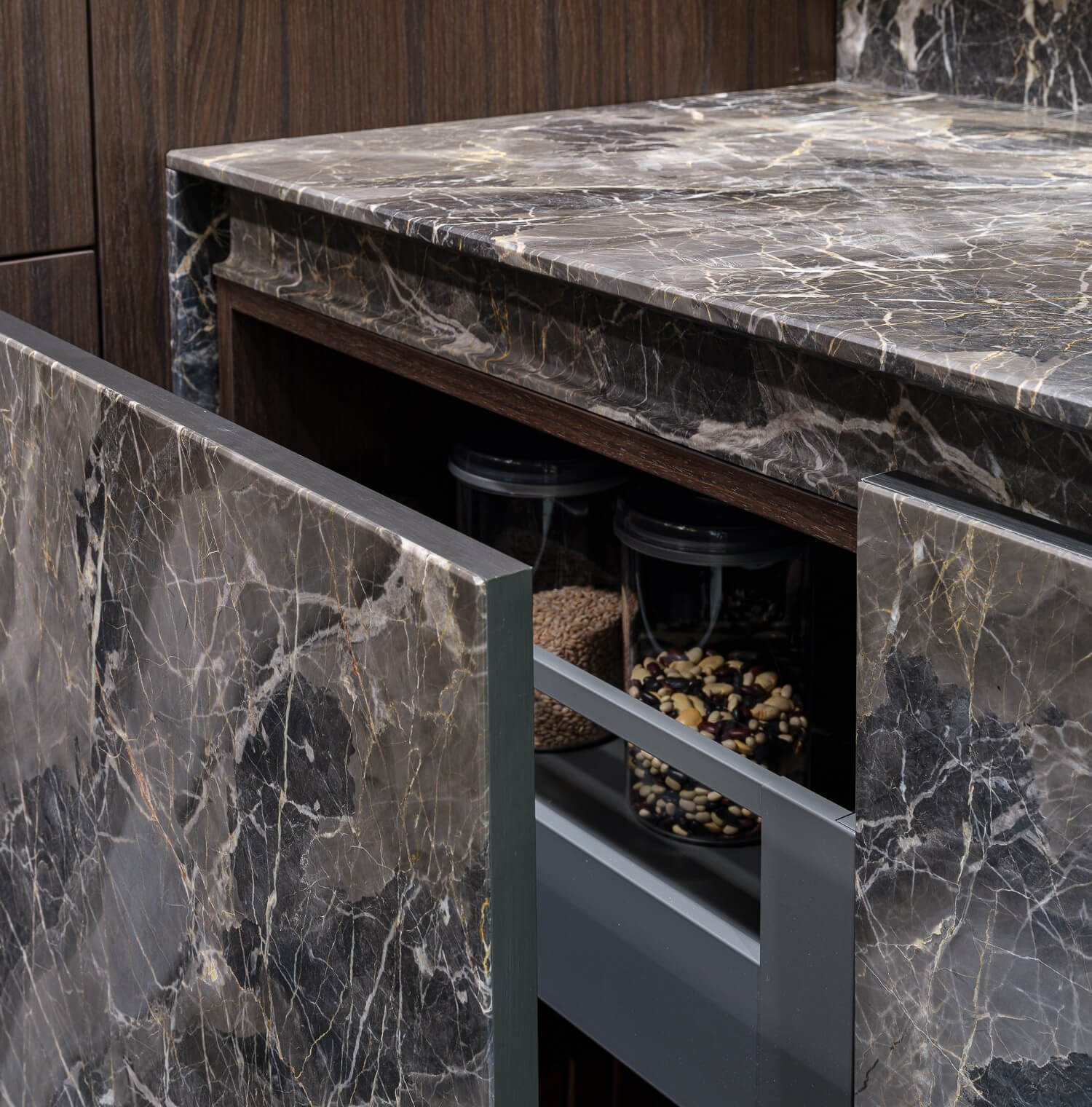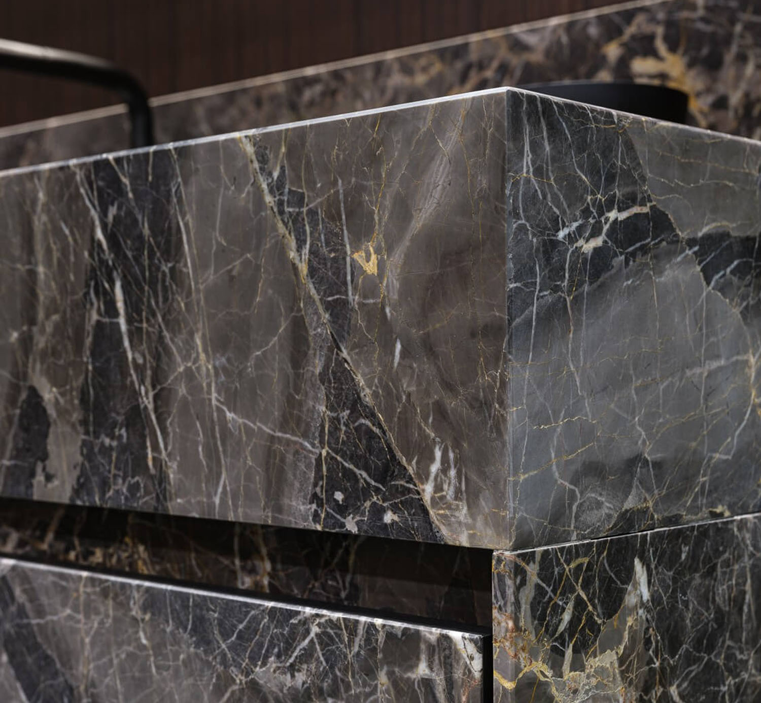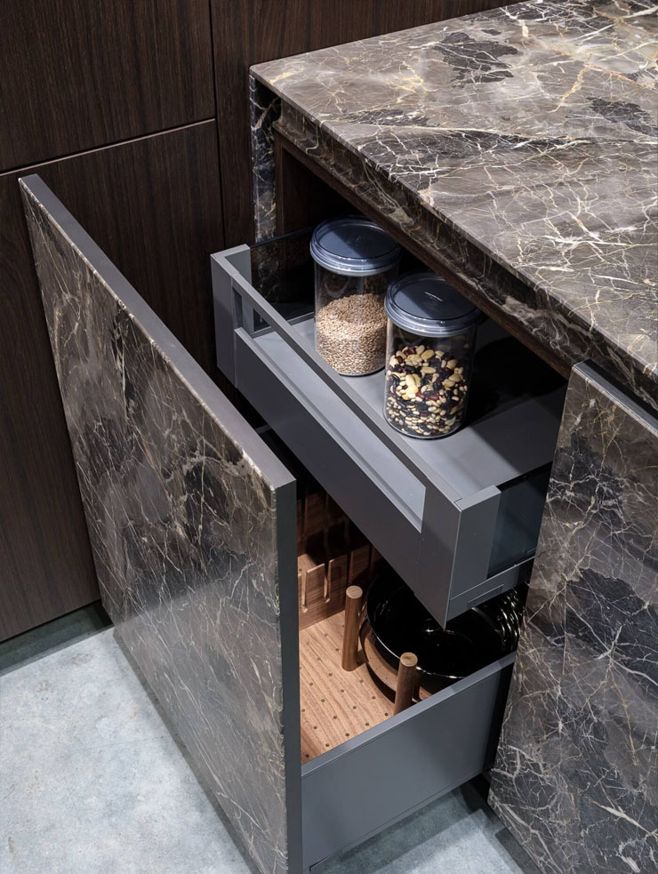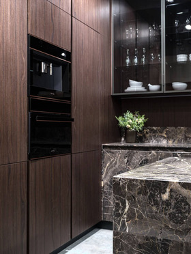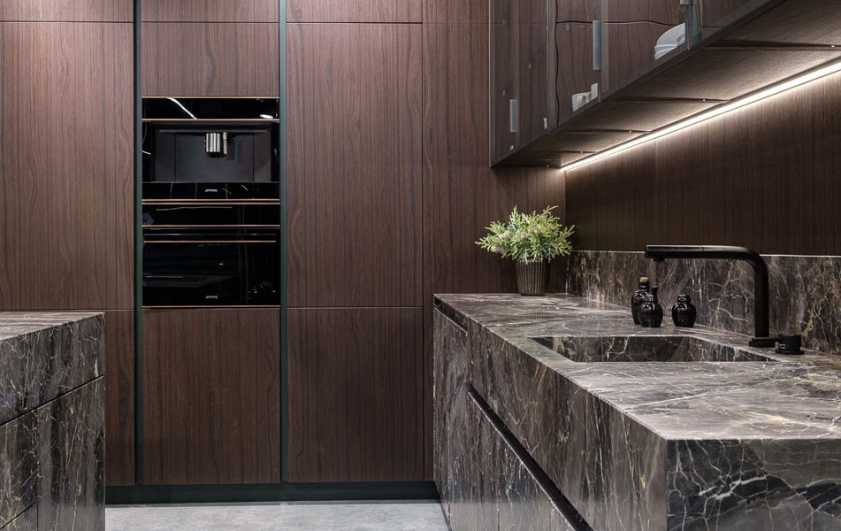 Геометрическая строгость форм, прозрачность ряда элементов, дополненные чистотой цвета камня и приглушенными красками дерева формируют атмосферу уверенности, достоинства и покоя.