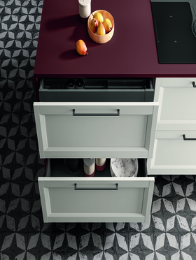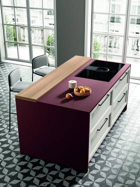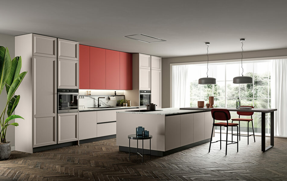 Фартуки и столешницы в глубоком оттенке Fenix Rosso Jaipur становятся визуальным центром кухни Futura. Контраст текстур и цветов создаёт динамичное, но гармоничное пространство — живое, выразительное и идеально сбалансированное между дизайном и функциональностью.