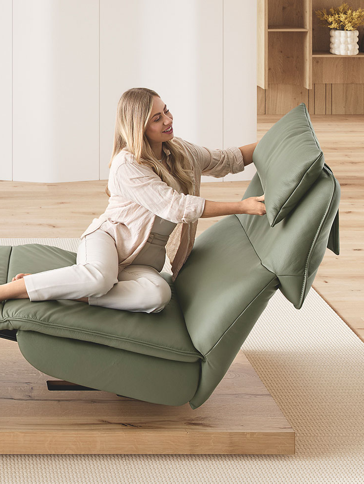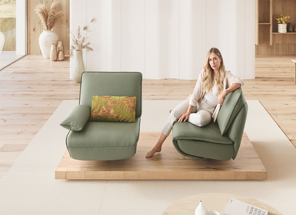 Эта модель оснащена моторизованной системой регулировки спинки и подножки в позиции «heart-balance», обеспечивающей оптимальное расслабление. Возможность вращения до 320° и боковое смещение вручную делают диван невероятно функциональным и гибким в использовании.