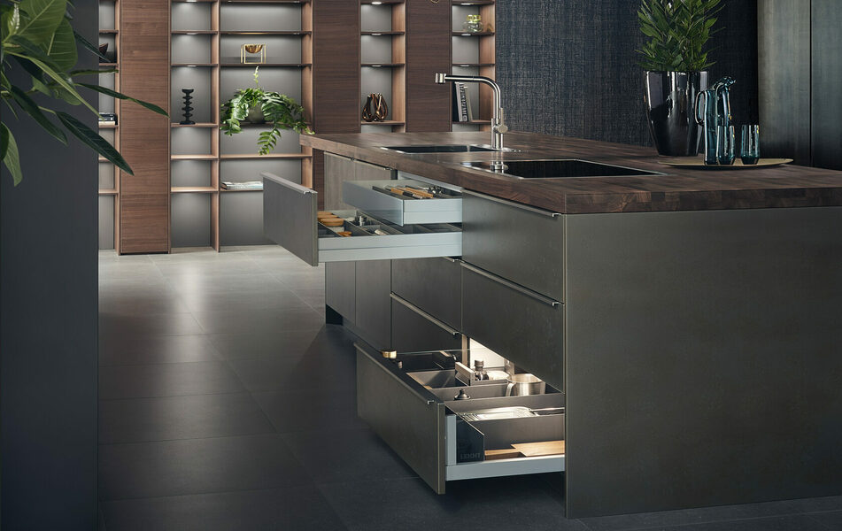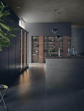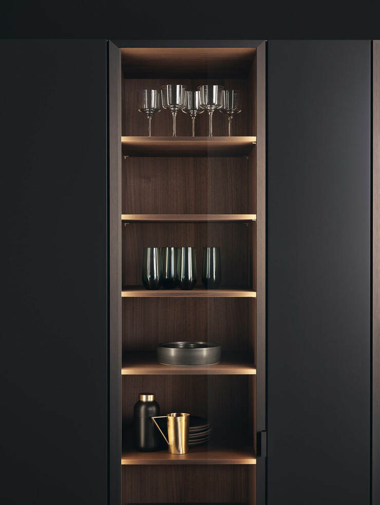 Пространственная атмосфера возникает в гармоничном взаимодействии материала и цвета, света и прозрачности. Шкафы-витрины отличаются тонким тонированным стеклом и изящной анодированной металлической рамой с разумно скрытой техникой шарнира.
