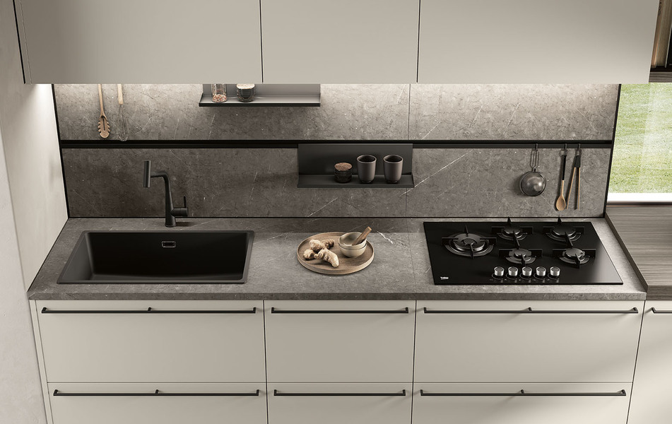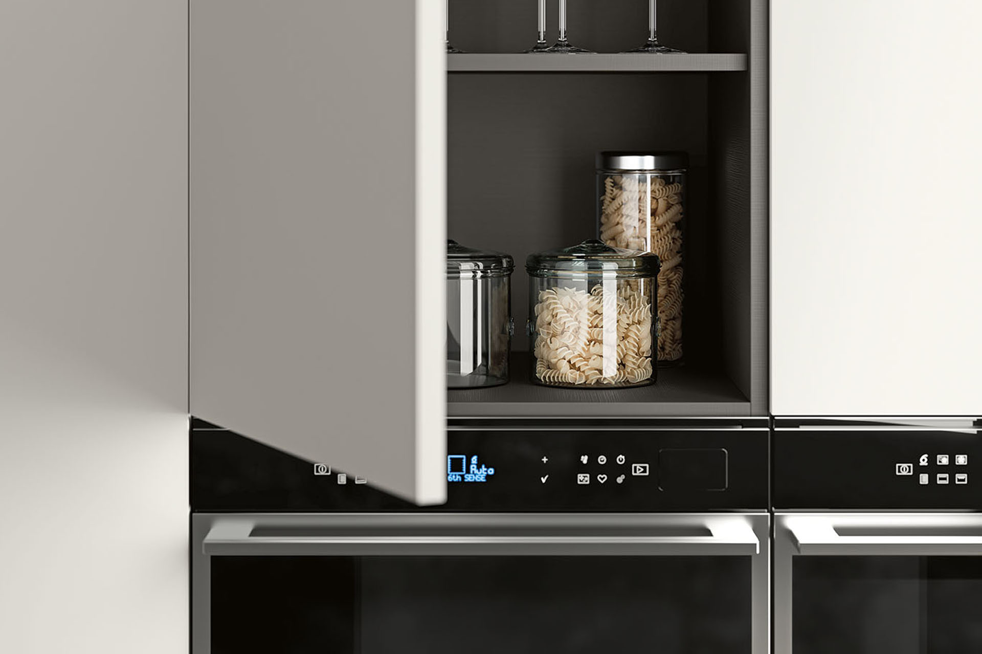 Квадратная дверь с ручкой или фигурным пазом идеально объединяет кухню и гостиную, создавая уникальные, многофункциональные пространства.
