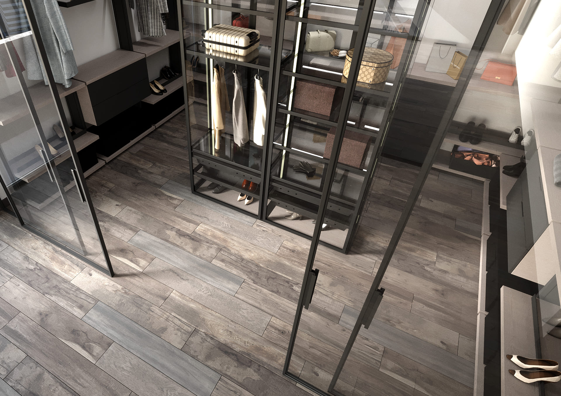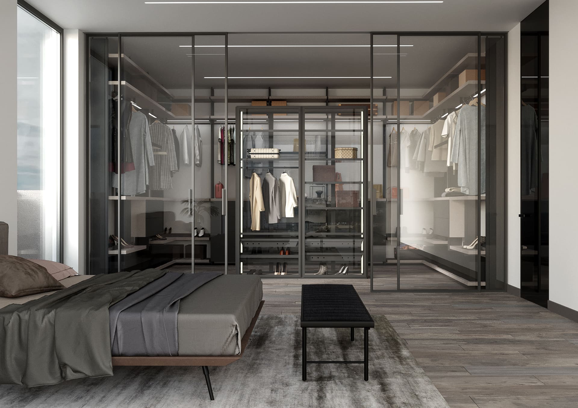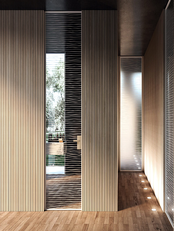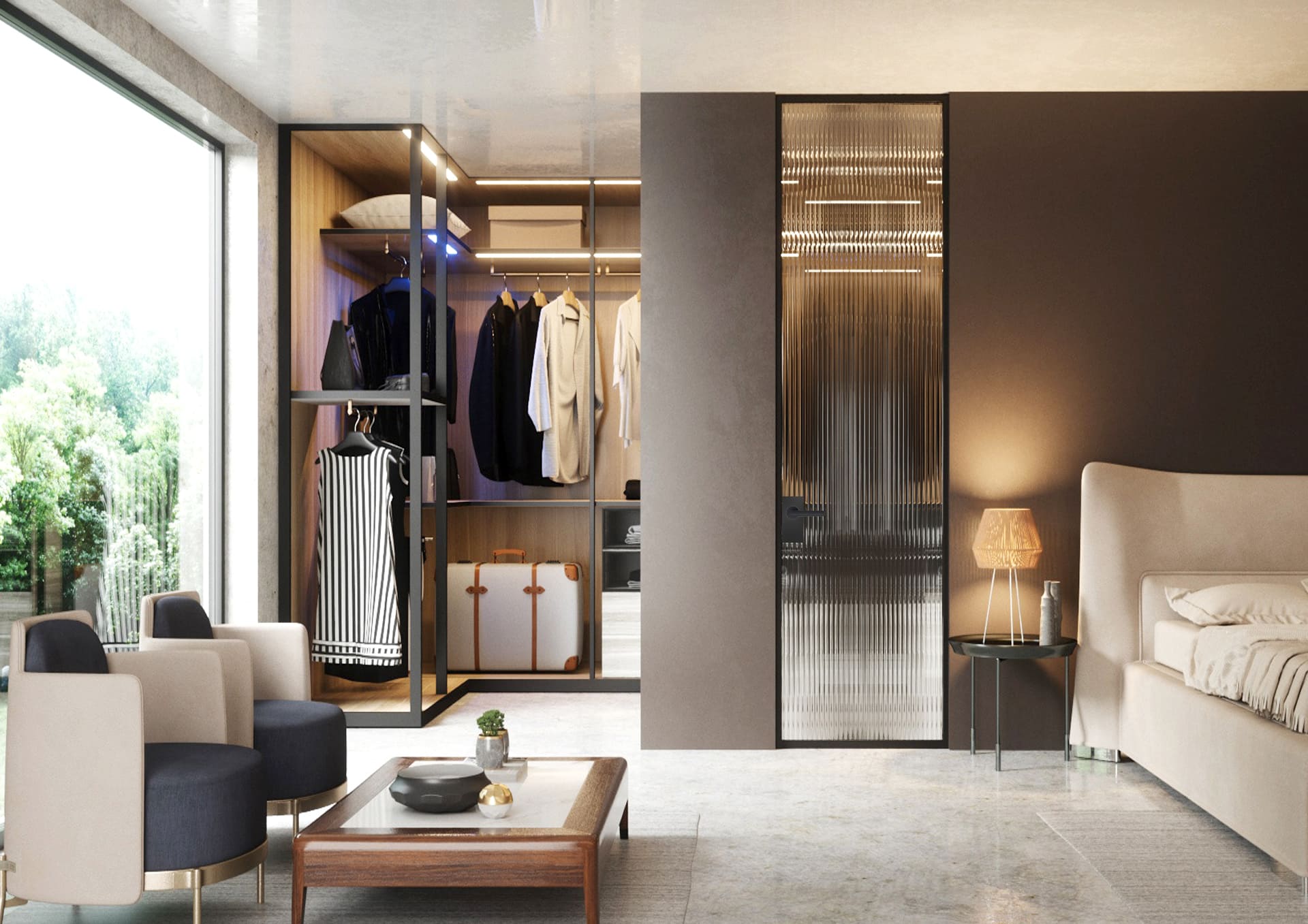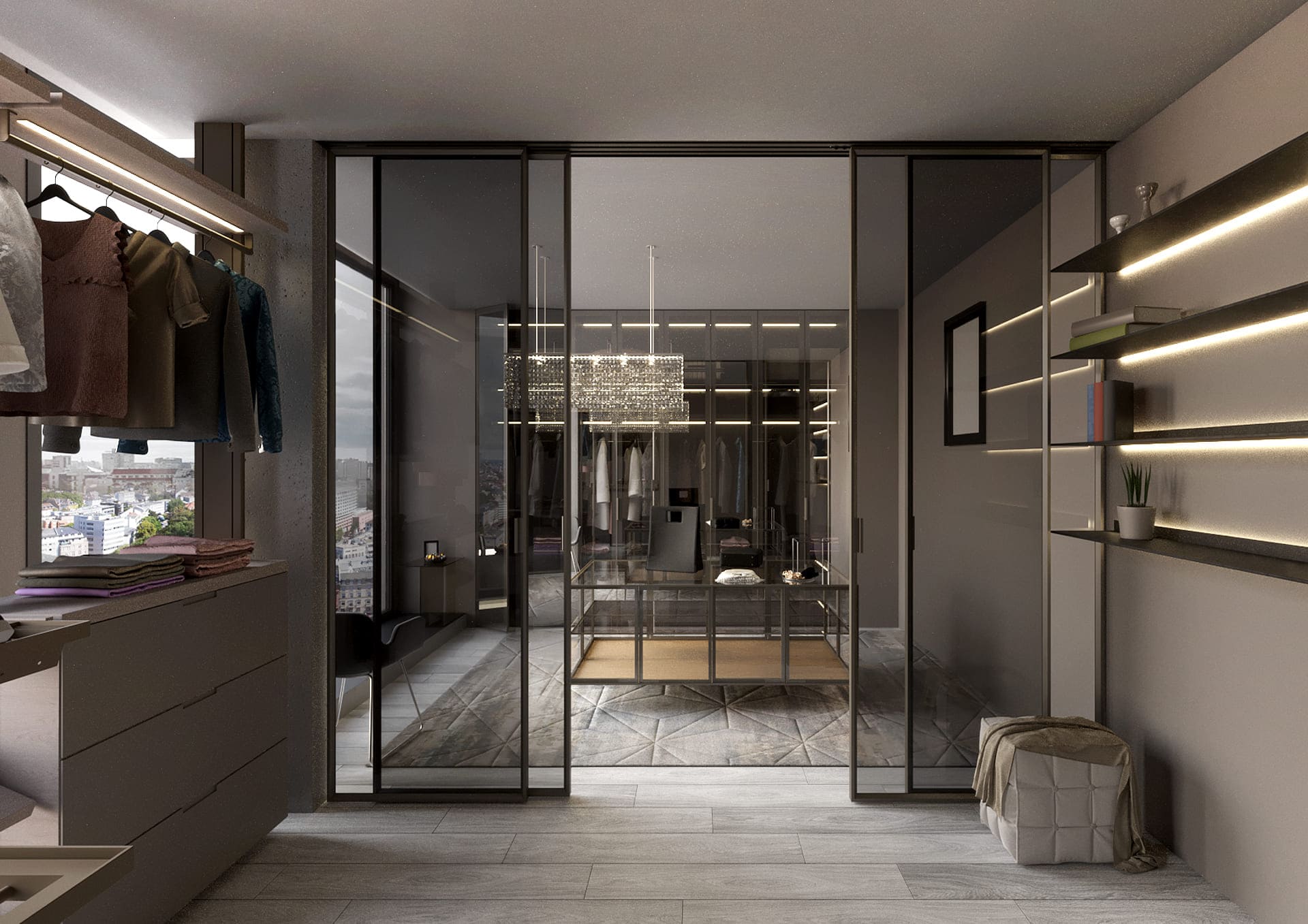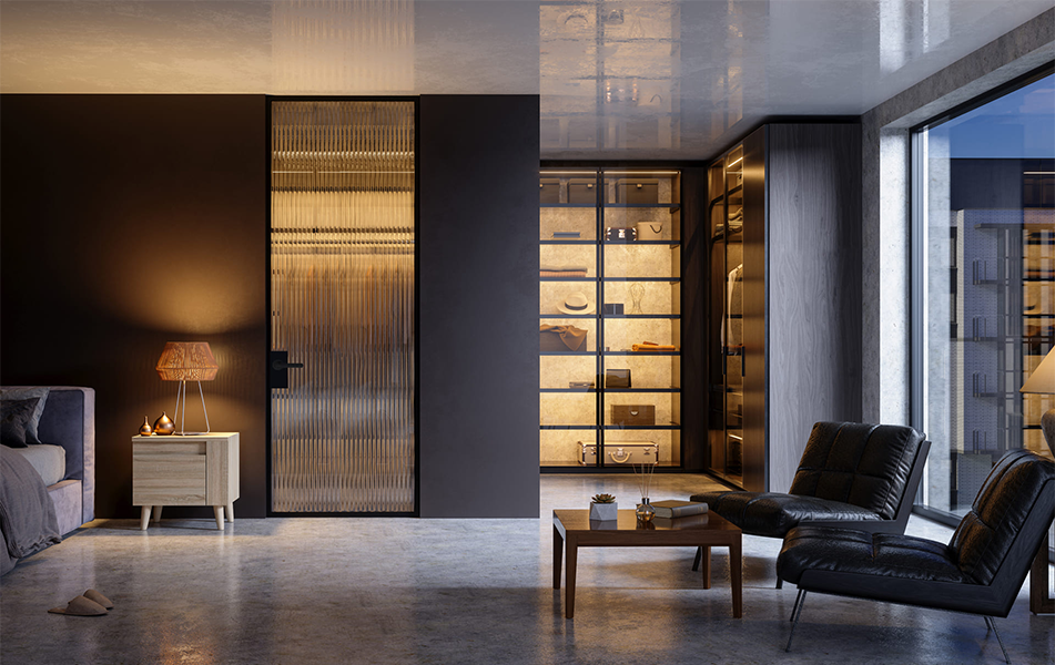 Система Grafia позволяет реализовать конструкции высотой до потолка — до 5 метров — что создаёт визуально чистое, просторное пространство. Возможность скрытого или открытого рельса усиливает ощущение лёгкости и утончённости интерьера.