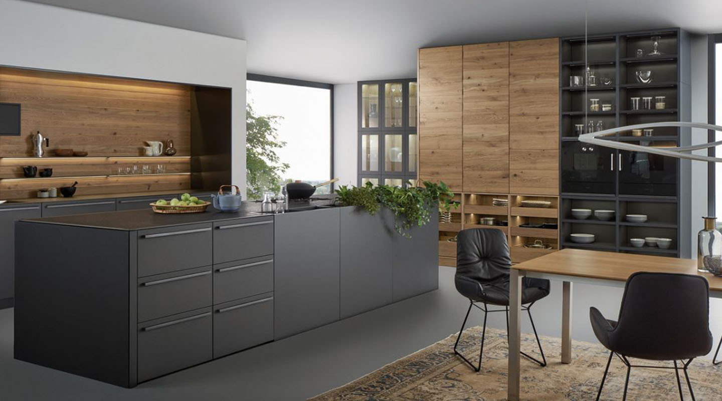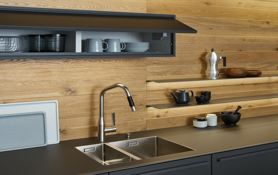 Характерно и достойно выглядит поверхность из дуба с его выразительной рельефной структурой. На контрасте с ней четкие контуры фронтов и столешницы. Вдохновляет также микс материалов: структурированное дерево с его теплой тональностью сознательно противостоит матовому лаку серого карбона