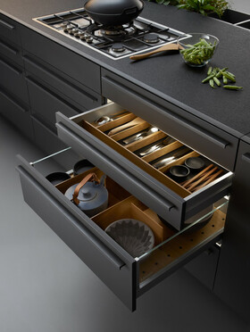 Спокойные, непрерывные фронты чередуются с незаметно освещенными витринами и открытыми полками. Исследовать внутренний мир - это чистая радость: вставки и деления из высококачественного натурального дерева позволяют легко поддерживать порядок