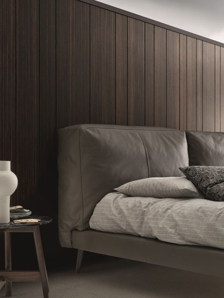 Эта кровать занимает особое место между актуальными трендами и атмосферой семейного уюта. Мягкие формы изголовья подчёркивают комфорт, а элегантные пропорции и выбор отделок делают её универсальным решением для спальни.