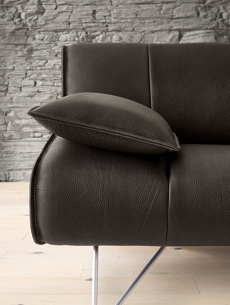Выразительная декоративная строчка выделяет чёткие внешние формы. Сидение плавно переходит в намёк на подлокотники, гармонично соединяясь со спинкой. Опциональный подголовник делает модель ещё более универсальной.