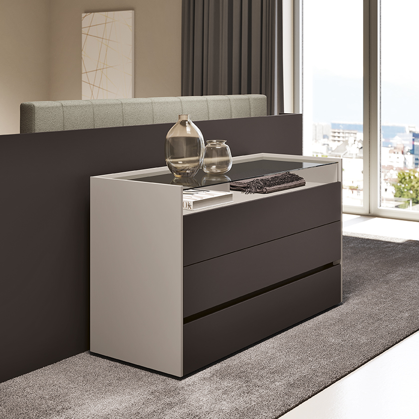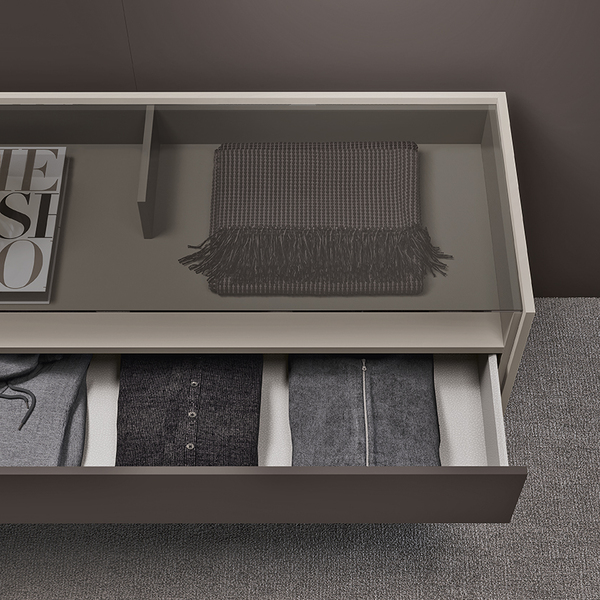 Комод Astrid — это гармоничное сочетание изысканного дизайна и практичного наполнения. Его главные акценты — утончённая горизонтальная ручка-паз и столешница из копчёного прозрачного стекла, которая словно парит над корпусом, открывая внутреннюю отделку и добавляя глубину визуальному восприятию.