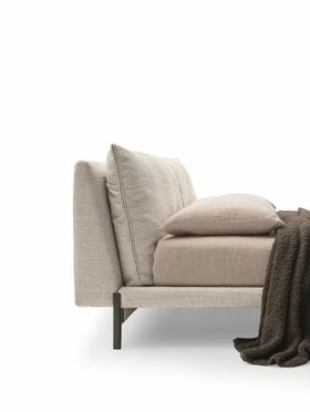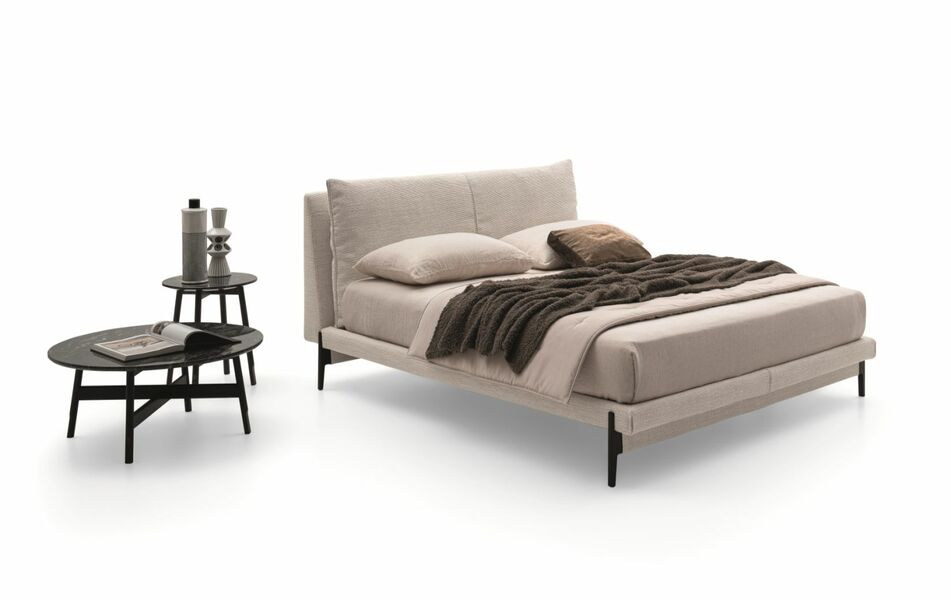 Кровать Kim повторяет элегантные линии одноимённого дивана, особенно заметные в изголовье и каркасе. Доступна в обивке из ткани, кожи или комбинированной версии, а также с двумя видами ножек — с опорой или без неё, позволяя создавать индивидуальный облик спальни.