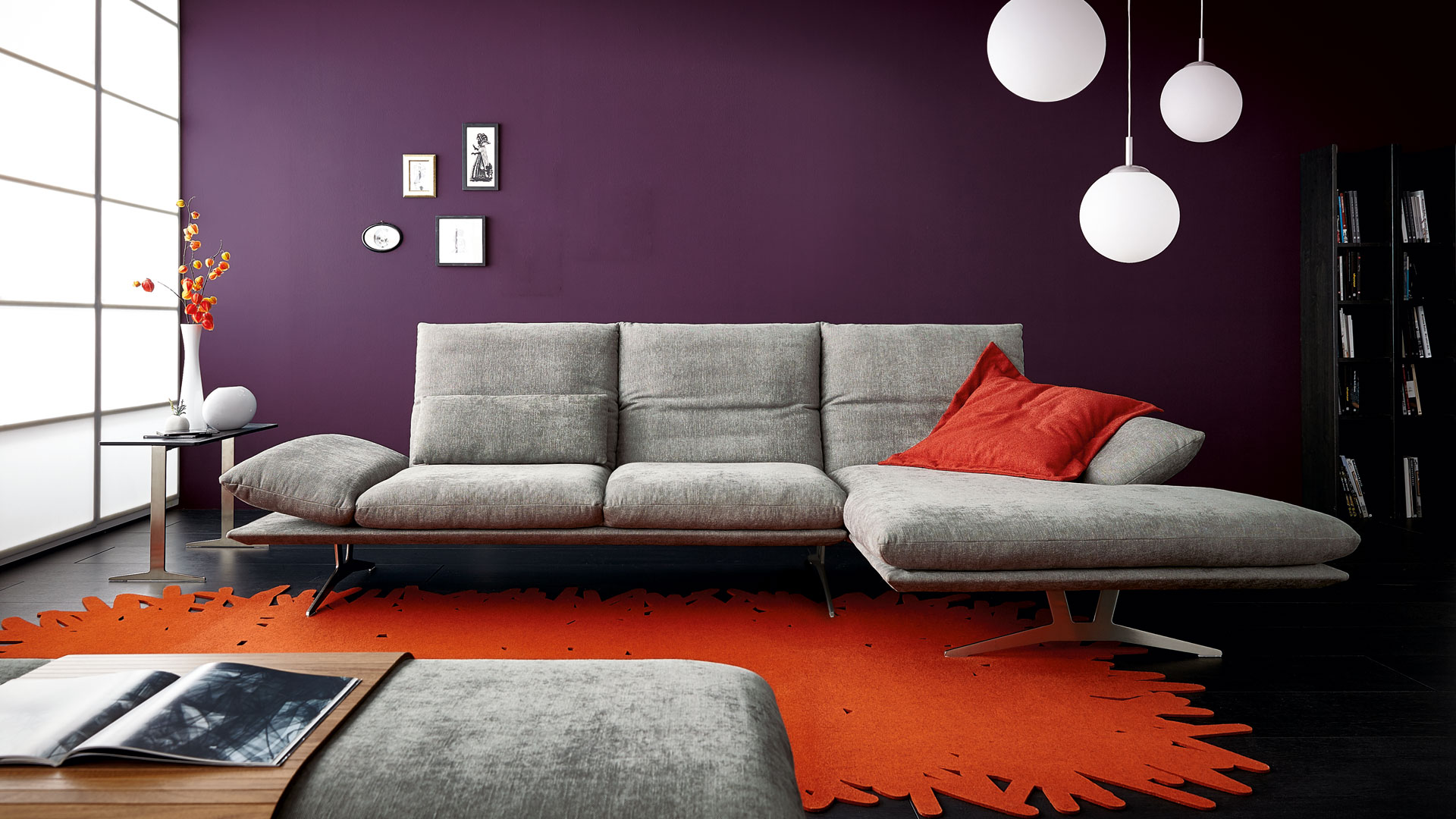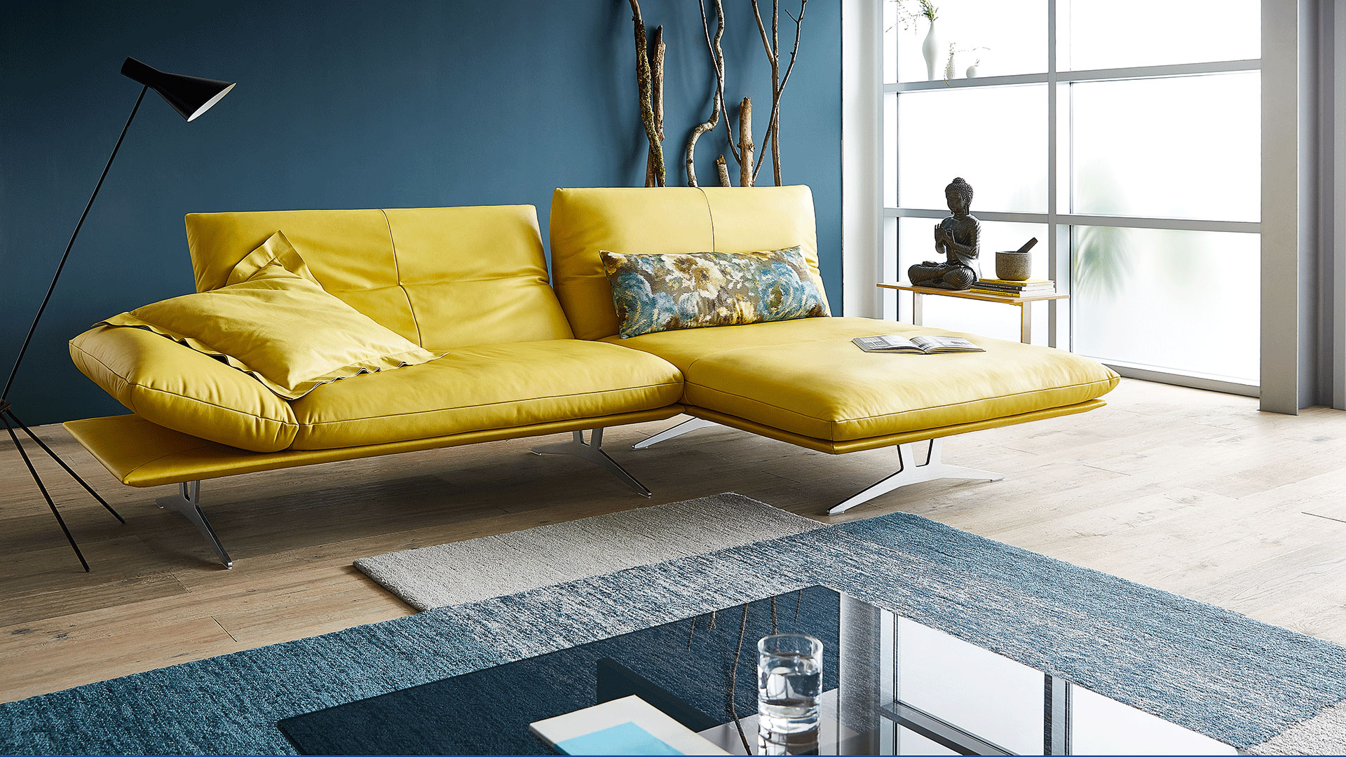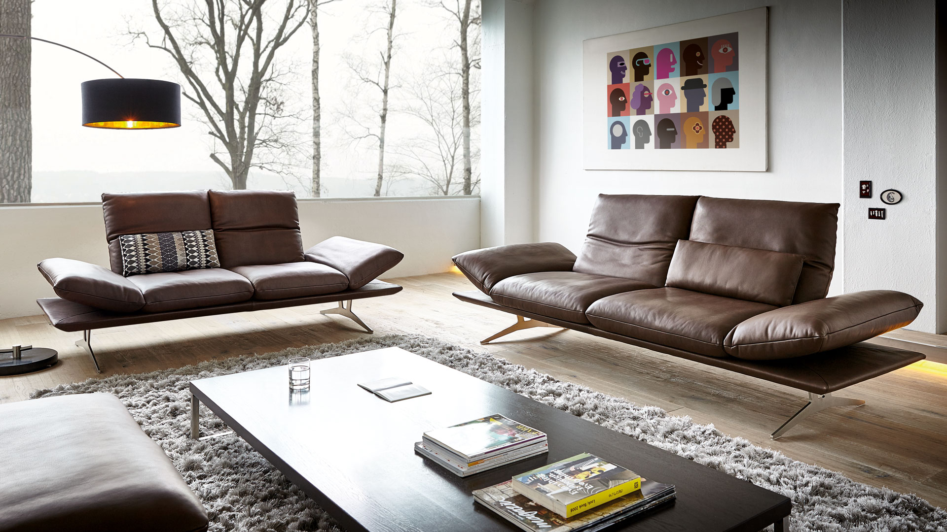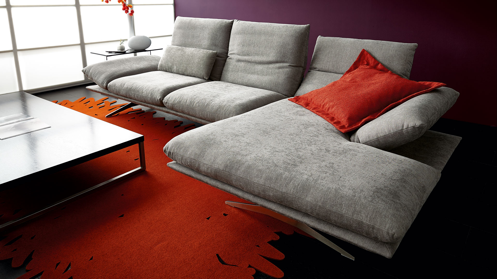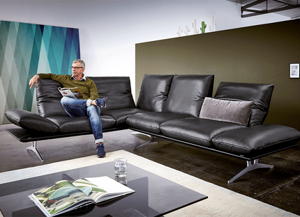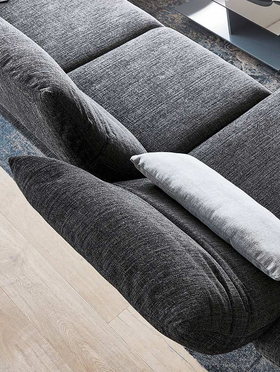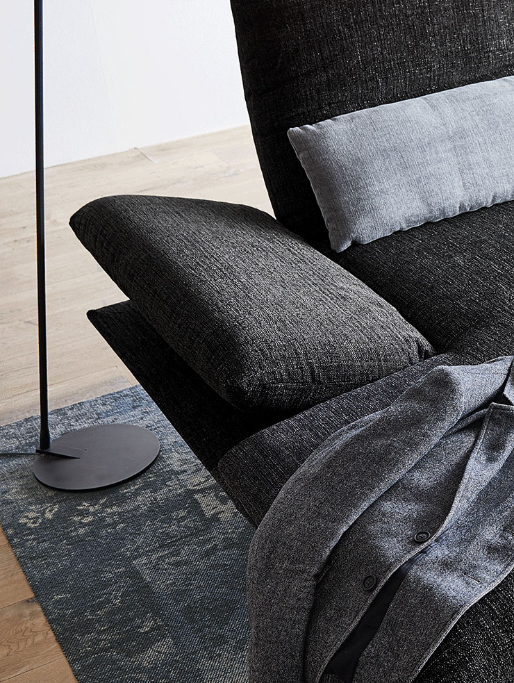 Элегантный диван с изогнутыми металлическими опорами словно парит в пространстве, при этом предлагая гибкие настройки спинки, подголовника и подлокотников для абсолютного комфорта.