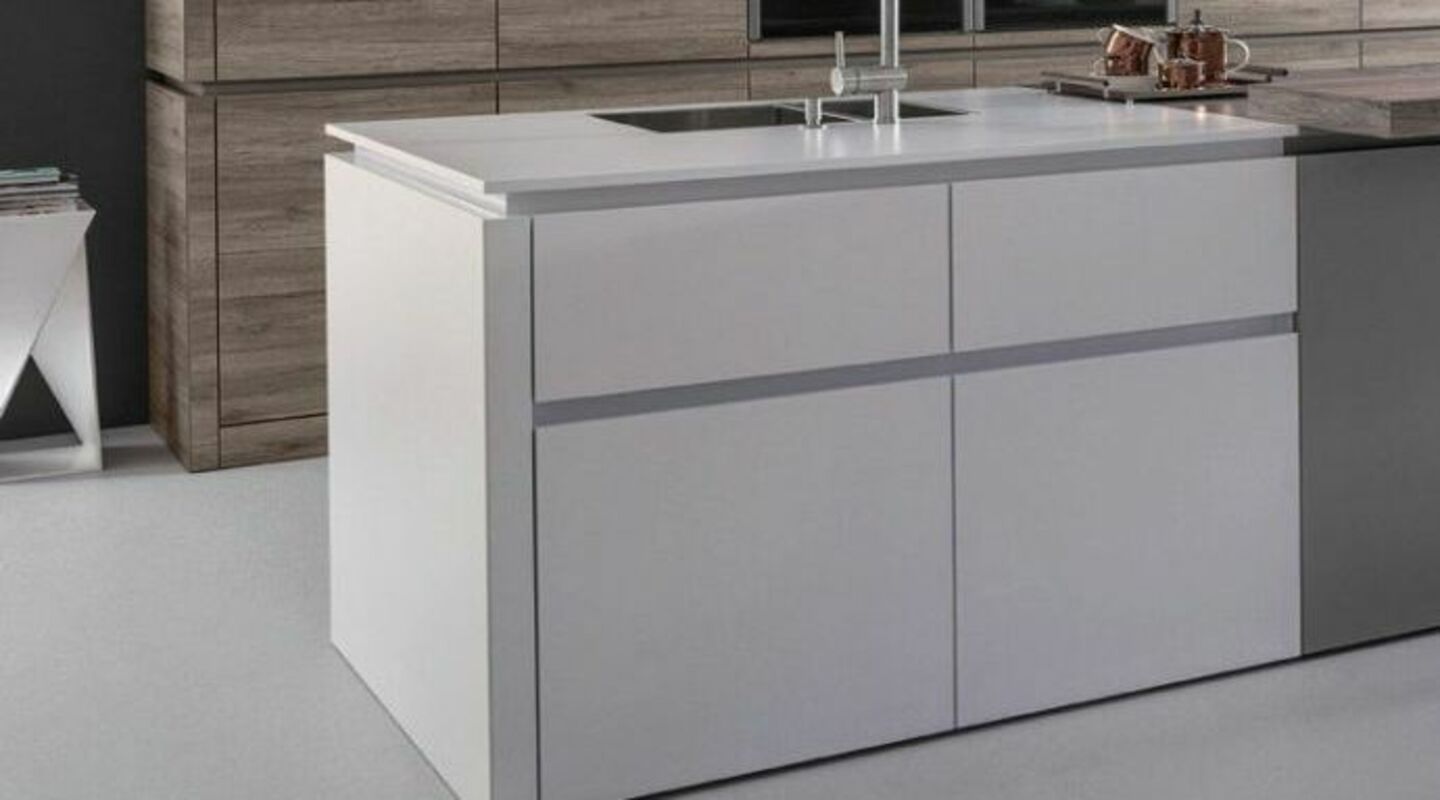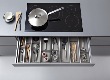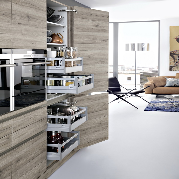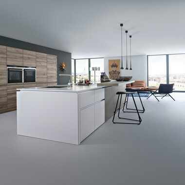 Материалы и цвета подчеркивают архитектуру помещения. Декор античного дуба, который выглядит особенно естественно с его видимыми сучками, трещинками и осязаемой текстурой, оживляет стену высоких шкафов без ручек. Столешница для барной стойки толщиной 6 см из античного дуба создает оптическую связь между высокими шкафами и островом