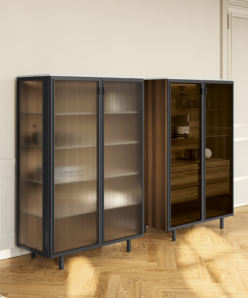 Комод Aurora — это стильный акцент с архитектурным характером. Его изящный силуэт основан на визуальной лёгкости: тёмный металлический профиль в оттенке Carbon обрамляет стеклянные фасады, создавая выразительный контраст и подчёркивая геометрию конструкции.
