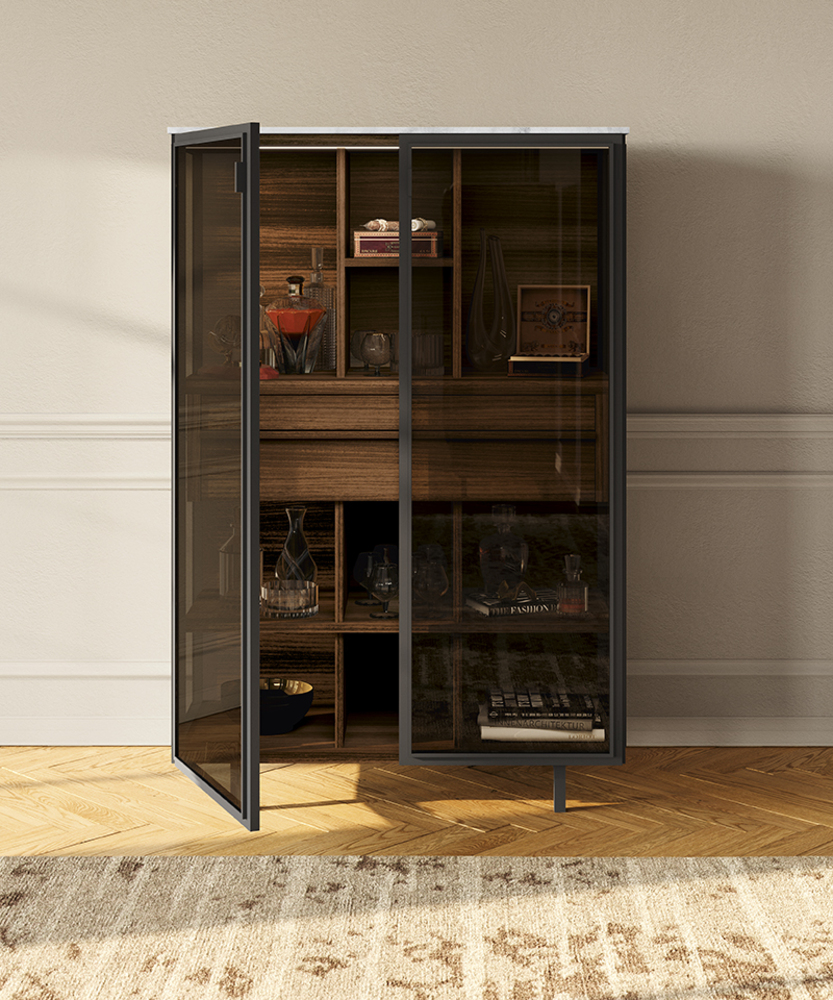 Внутреннее пространство продумано до мелочей: оно позволяет одновременно хранить и демонстрировать — книги, посуду, коллекционные предметы или декоративные элементы. Высокая модель может быть дополнена барным модулем, превращая комод в функциональную зону для приёма гостей или вечернего отдыха.