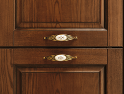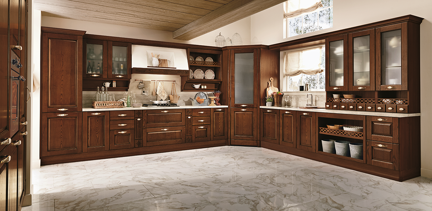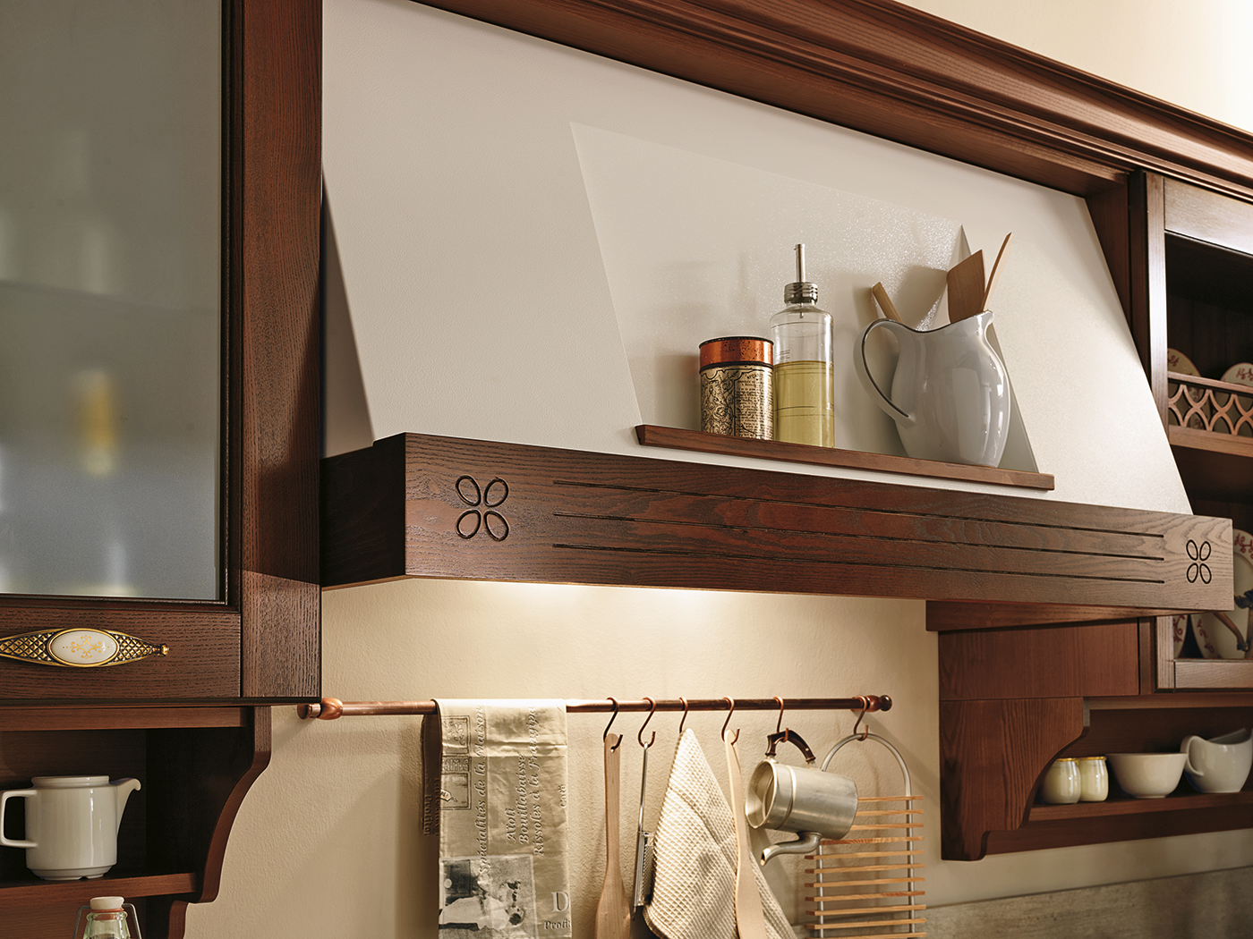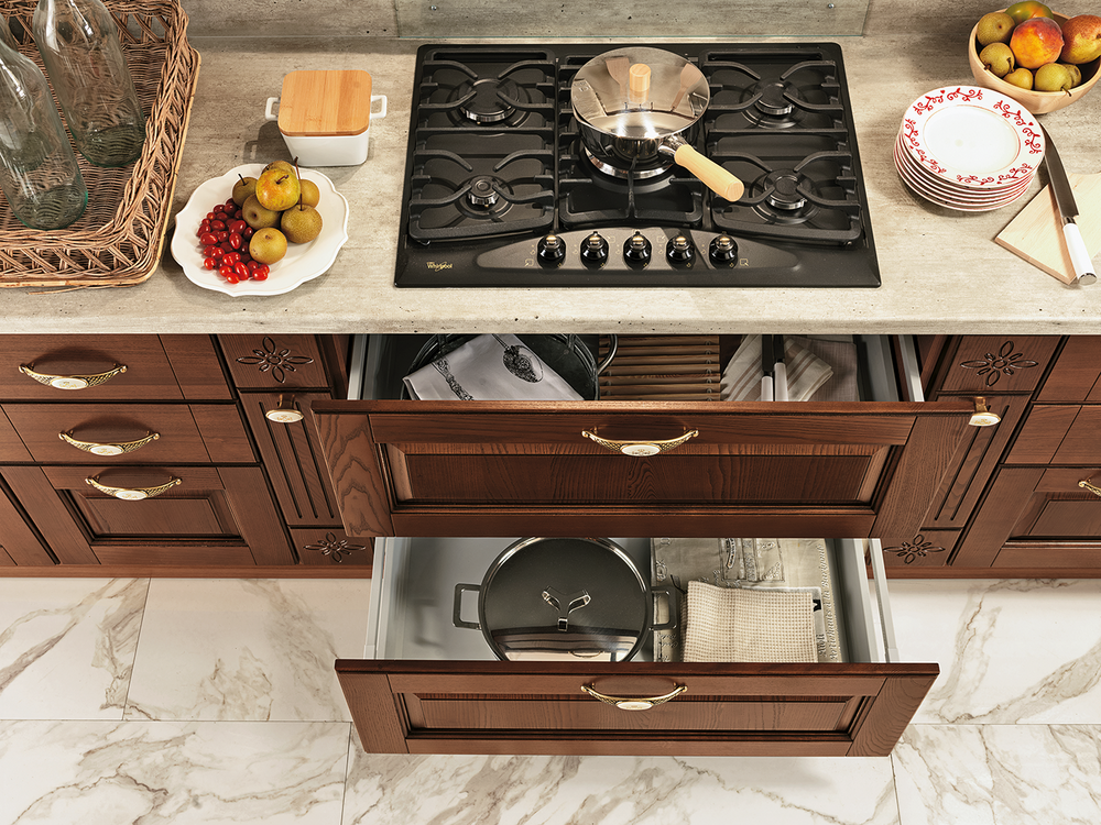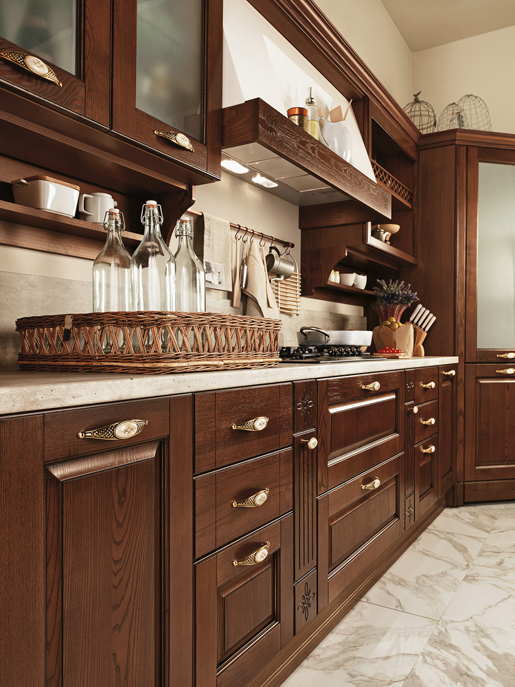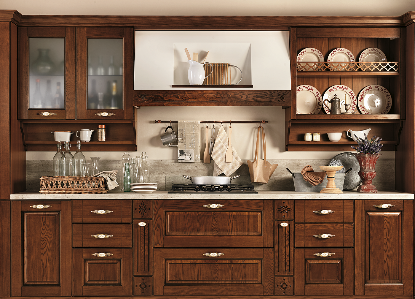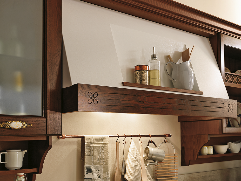 В интерьере Armonia 02 тёплые тона древесины и изысканная отделка сочетаются с мягкими формами и выразительными деталями. Это кухня, где каждый фасад словно рассказывает историю — о семейных традициях, уютных вечерах и любви к дому. Витражные вставки, резные элементы и фурнитура с эффектом старины придают композиции неповторимое очарование.