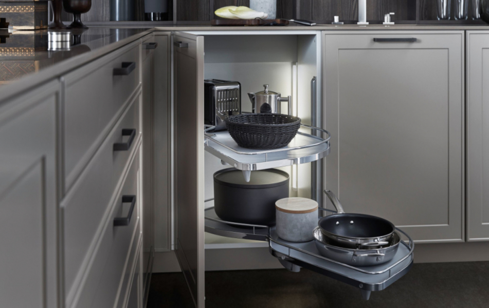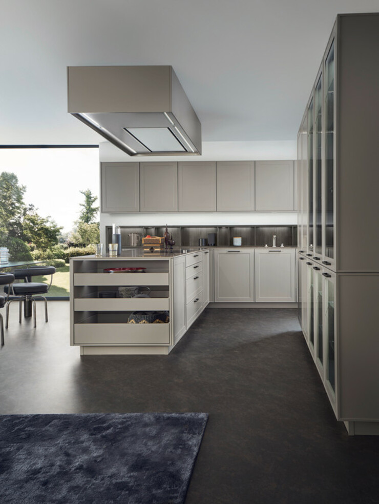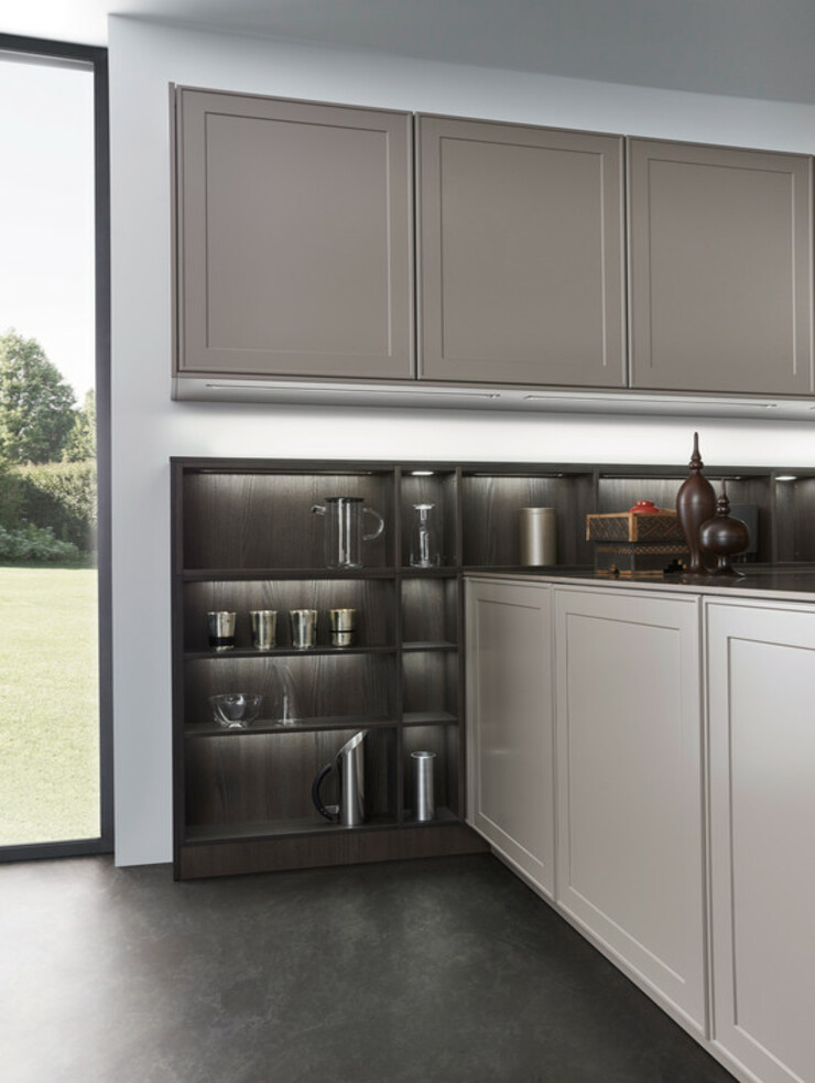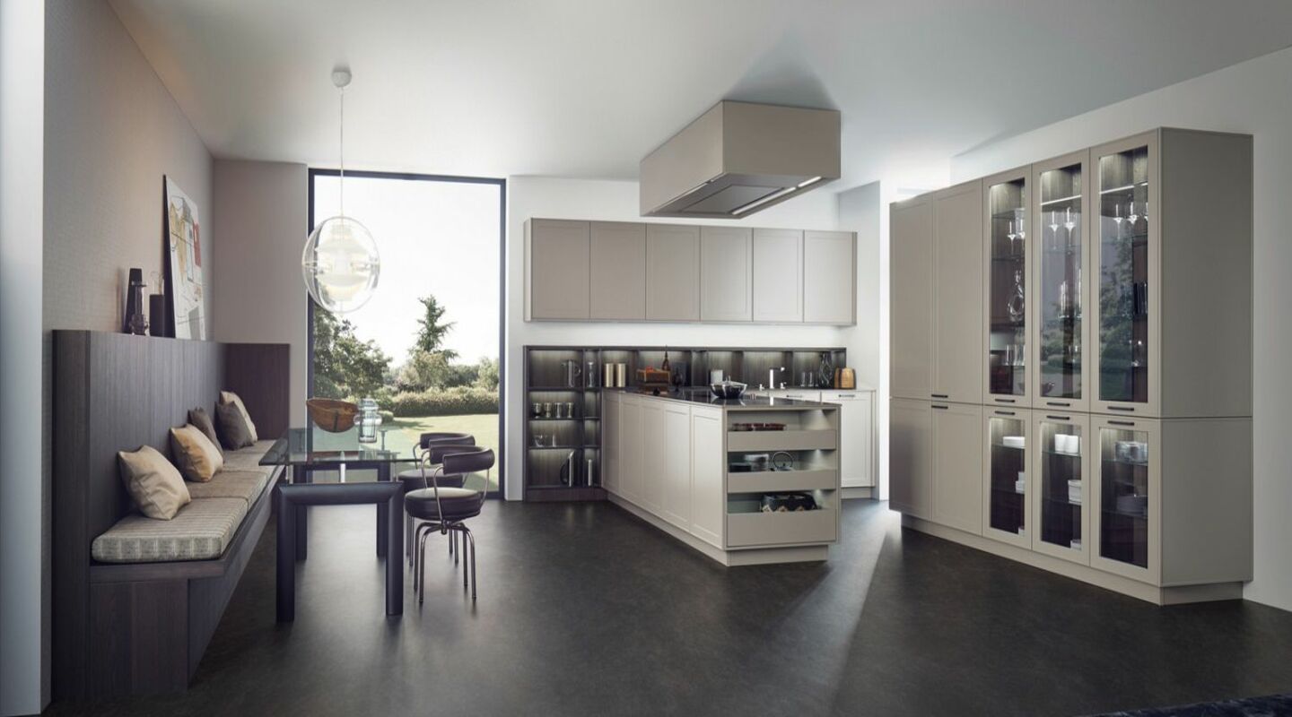 "Эмоционально привлекательная, неподвластная времени элегантная кухонная атмосфера характеризуется матово лакированными рамочными фронтами, которые выдержаны в теплом тоне Умбра из цветовой гаммы Les Couleurs® Le Corbusier. Комфортно выглядит парапет из характерного натурального дерева со встроенной скамьей