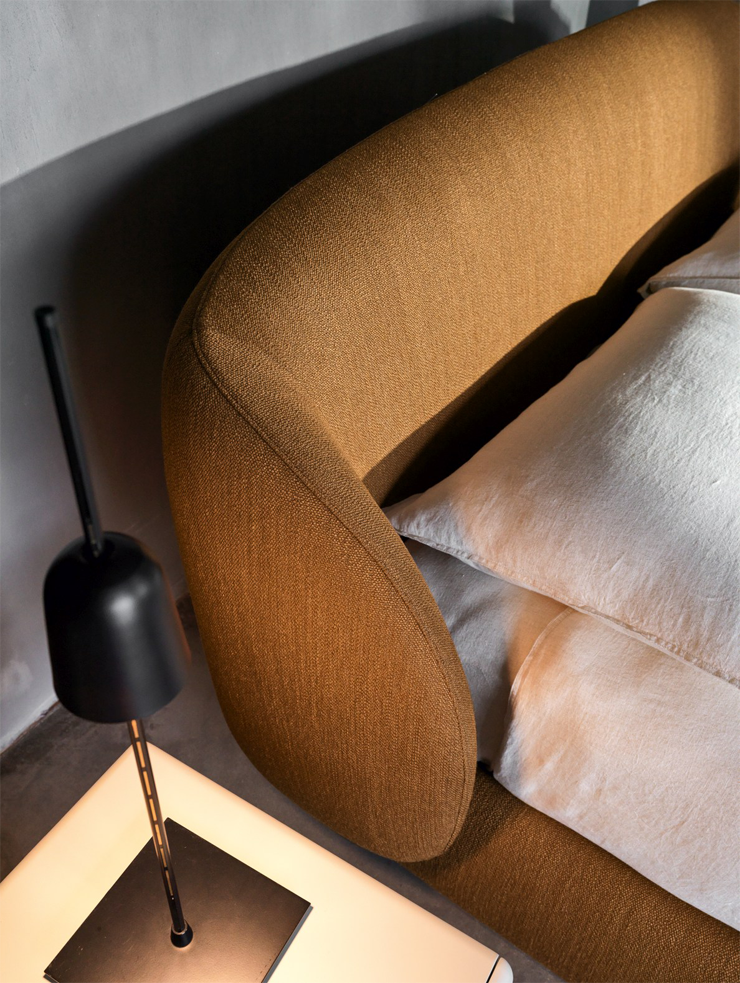 Кровать с высокой скульптурной спинкой и округлыми формами становится не только удобным местом для сна, но и декоративным элементом. Pacific создаёт уютное пространство, в котором легко расслабиться и почувствовать себя в безопасности.