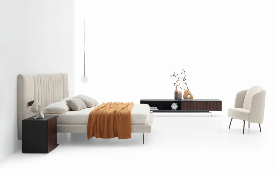 Кровать Otello оснащена мягким изголовьем с регулируемой высотой и представлена в трёх вариантах исполнения. Такая гибкость делает модель идеальным выбором как для стильных домашних интерьеров, так и для гостиничных пространств.