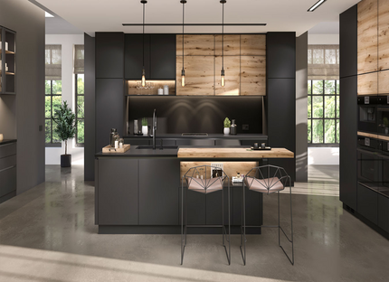 Эта кухня соединяет выразительность натуральных текстур с четкими геометрическими линиями. Толстые столешницы и минималистичный дизайн подчеркивают силу дерева, придавая интерьеру тёплый, но в то же время архитектурно строгий характер. Loft Wood — это когда кухня становится продолжением природы в городской среде.
