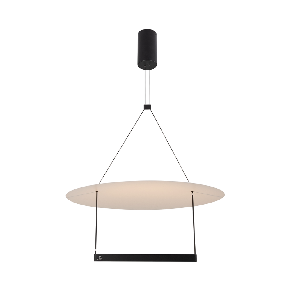 Контраст чёрной алюминиевой арматуры и белого диска подчёркивает графичность формы и делает светильник универсальным для современных интерьеров: кухни-столовой, гостиной, холла или зоны над столом. В модели используется тёплая цветовая температура 3000K, обеспечивающая уютную атмосферу.