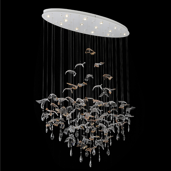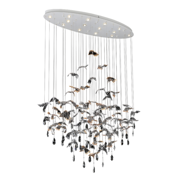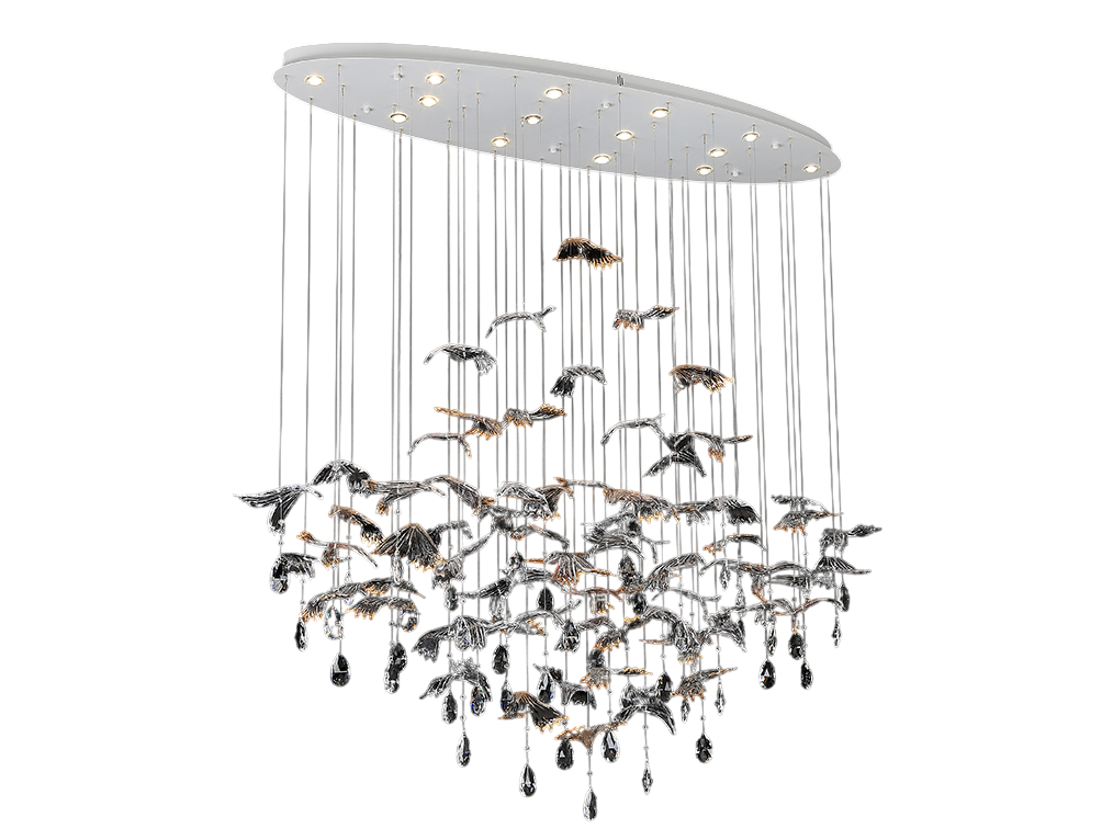 Модель рассчитана на 14 источников света и использует цоколь GU4, что делает её хорошим выбором для зоны столовой, гостиной или просторного холла — особенно над большим столом или в центре помещения.