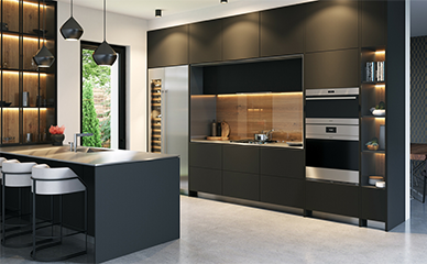 Модель ICBSO3050CM/S выполнена в сочетании чёрного глянцевого стекла и нержавеющей стали. Дизайн без выступающих элементов позволяет установить шкаф заподлицо, скрыв его в фасаде кухни.