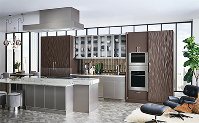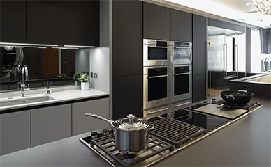 Модель выполнена в дизайне Transitional, где сочетаются чёрное глянцевое стекло и сталь. Минималистичный стиль позволяет установить шкаф заподлицо в мебельный фасад, делая его незаметным.