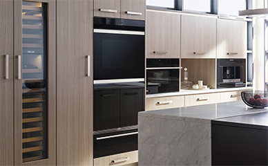 Коллекция Contemporary предлагает дизайн с глянцевым чёрным стеклом без ручек, который устанавливается заподлицо с фасадами кухни для чистого визуального стиля.