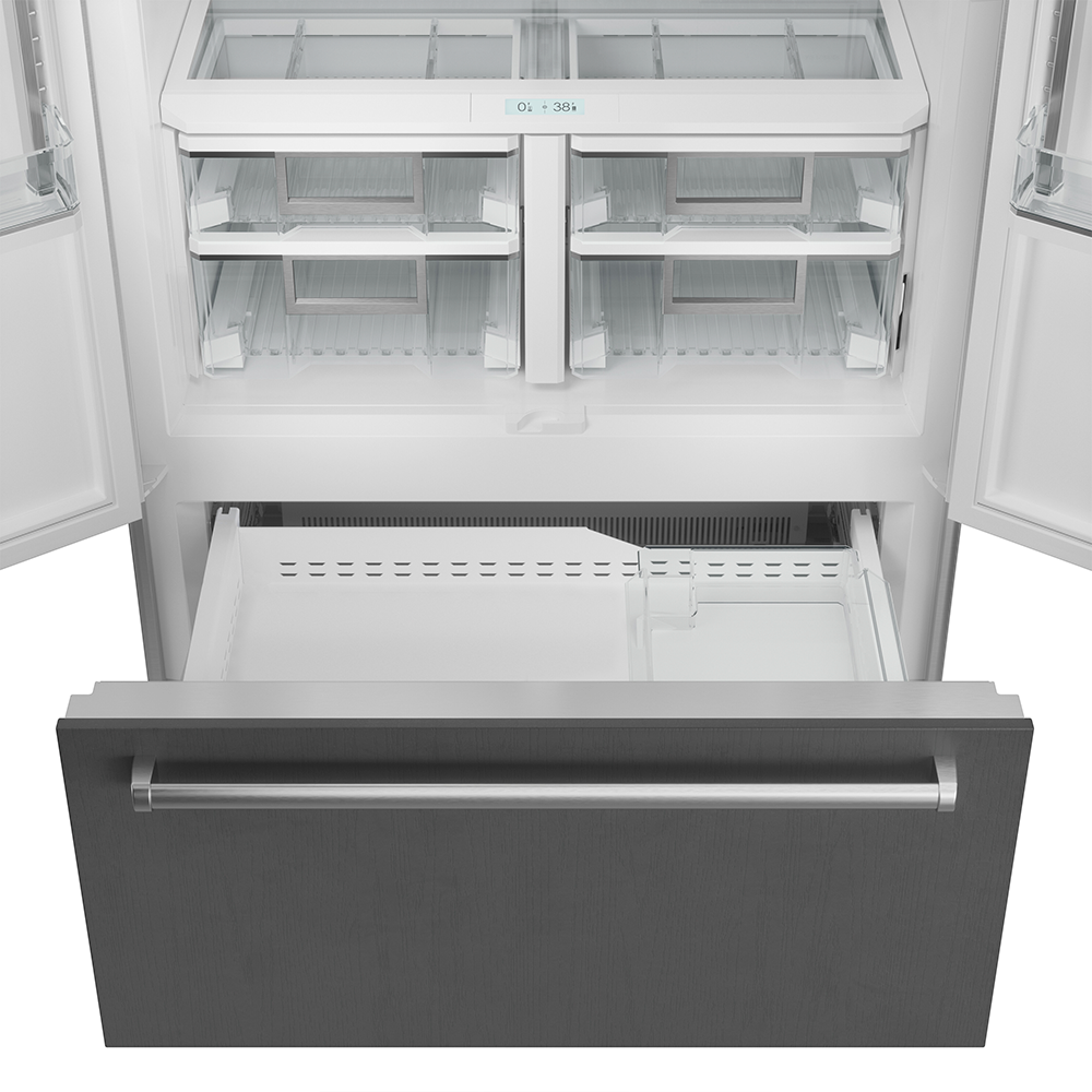 Модель оснащена французскими дверями и встроенным диспенсером воды, что исключает внешние выступы. Двойное охлаждение позволяет холодильной и морозильной камерам работать независимо.