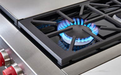 Газовые конфорки блока работают от 2,7 кВ до 5,3 кВ, с двухуровневой подачей газа. Теппан мощностью 4,5 кВ поддерживает ровную температуру.
